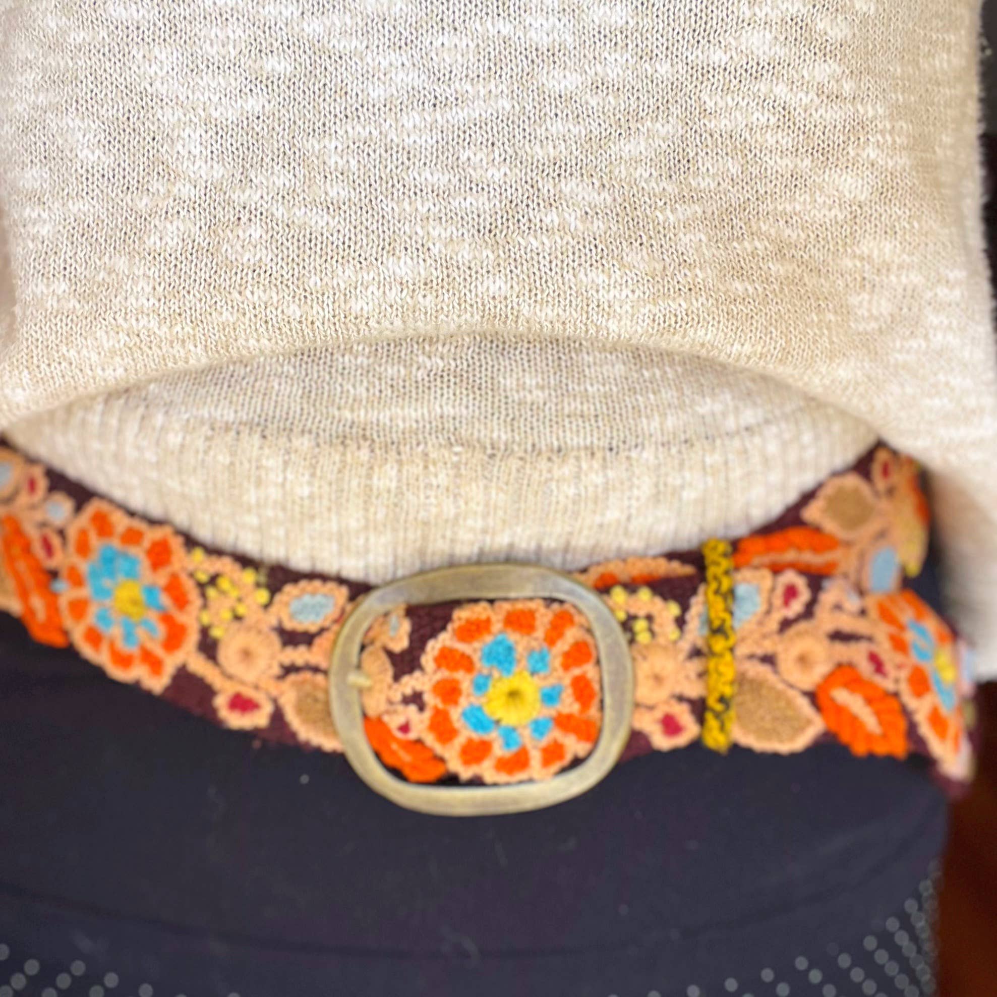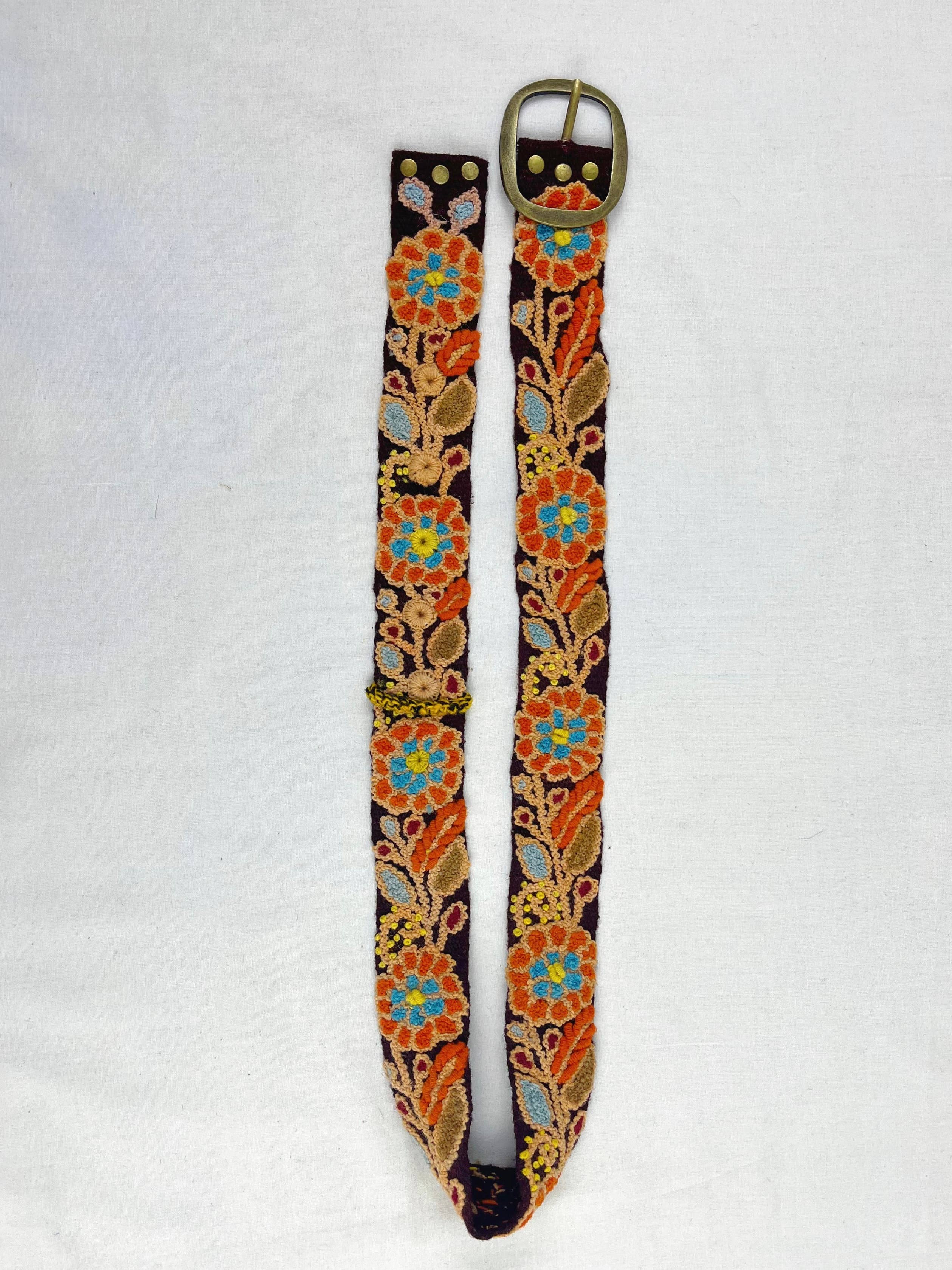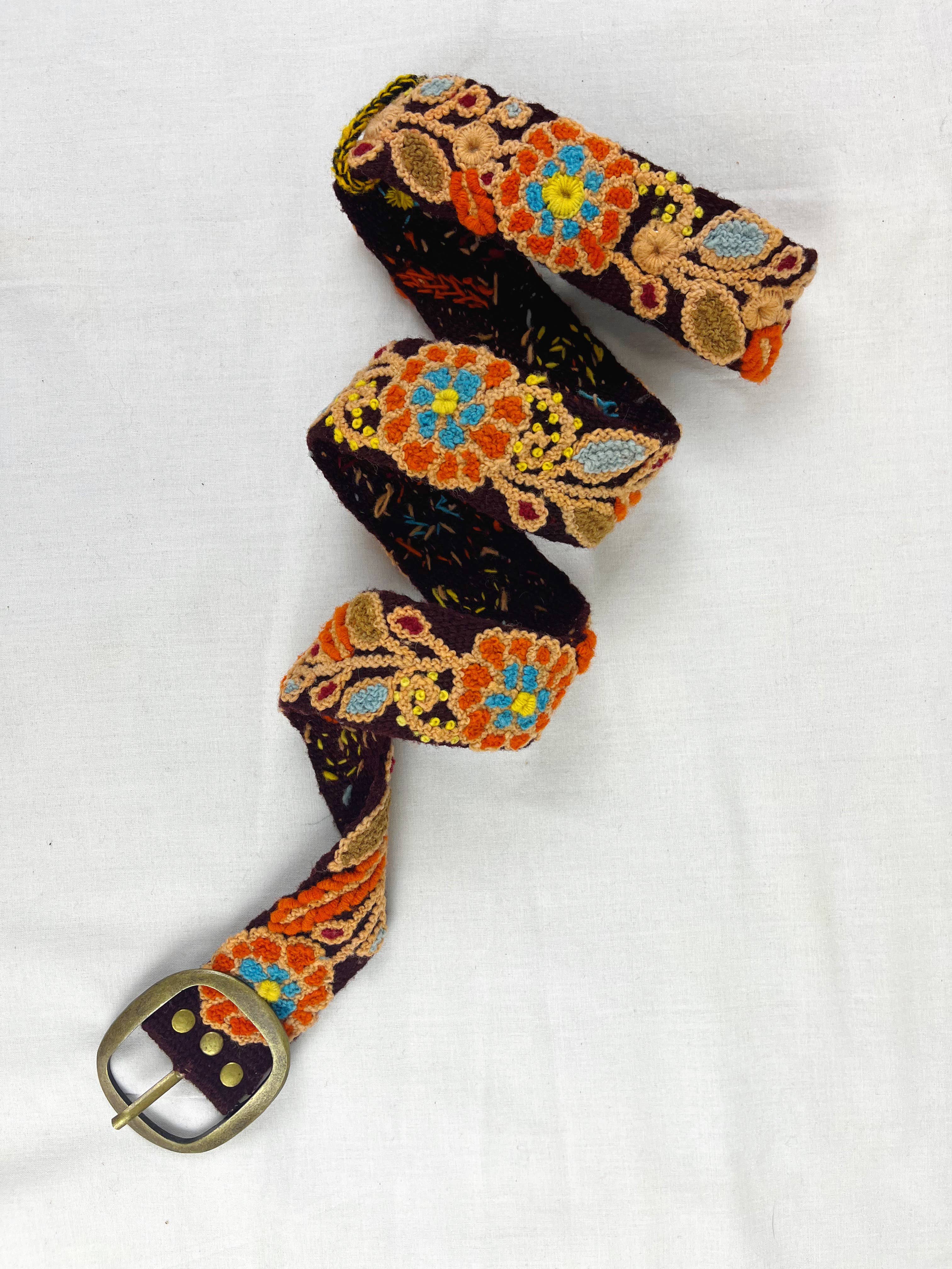 Our Dahlia Belt is the right design to add flair to your outfits this Season! Inspired by warm terracotta sunsets in the Andes, it features vibrant hand embroidery flowers over burgundy base. Each piece is skillfully hand embroidered in loomed wool, using vibrant alpaca yarn by our partner artisans in the Peruvian highlands.