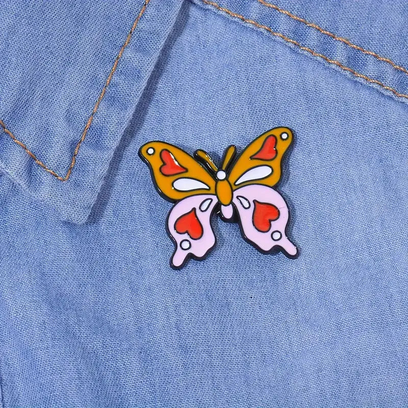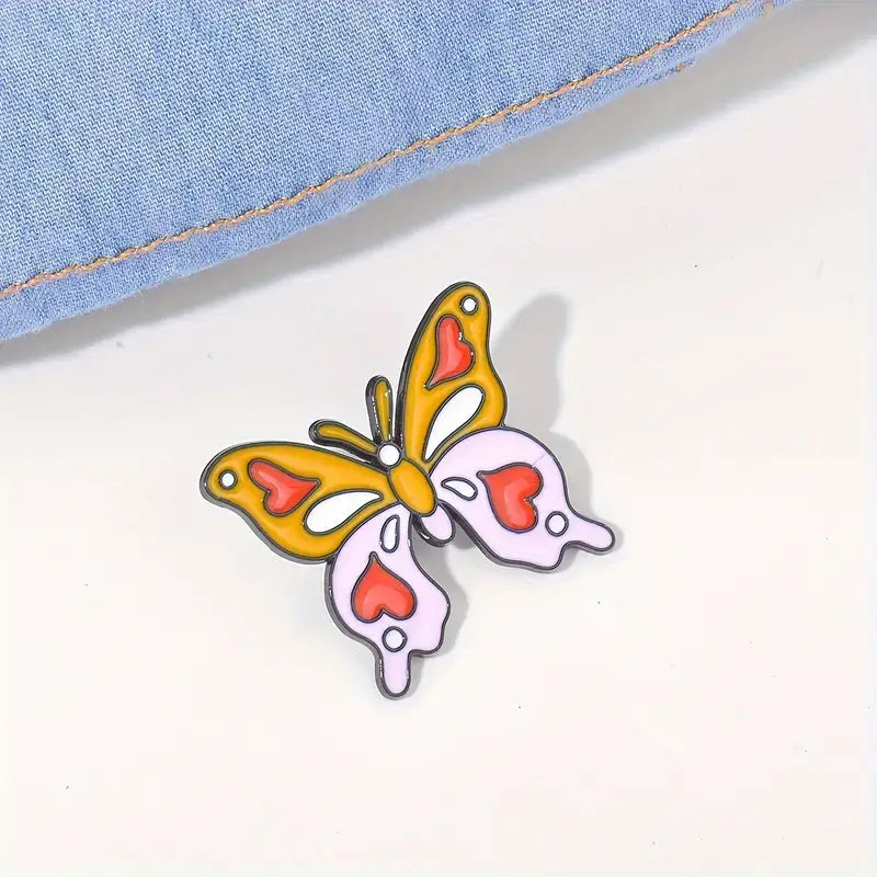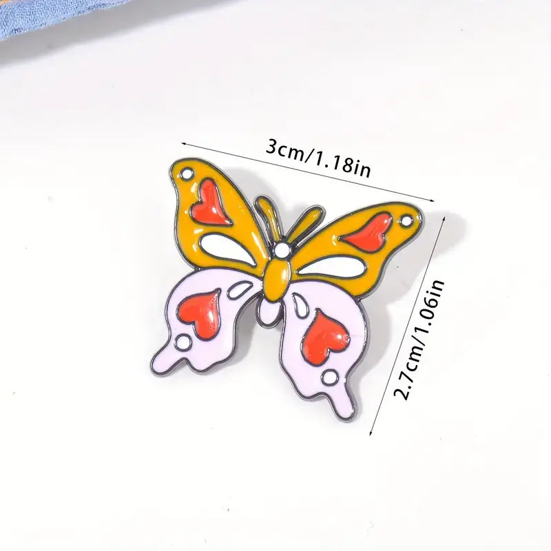 This delightful enamel butterfly pin features a whimsical design with heart-shaped accents. Measuring 3cm x 2.7cm, it's the perfect size for jackets, bags, or hats. The vibrant yellow and soft pink colors, complemented by red hearts, make it an eye-catching accessory.