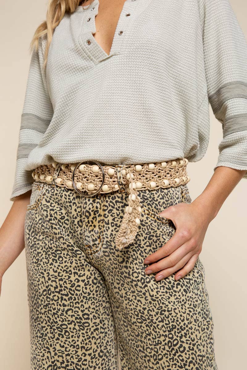 Leatherette belt with string knotted and twisted detail with beads in between and finished with silver