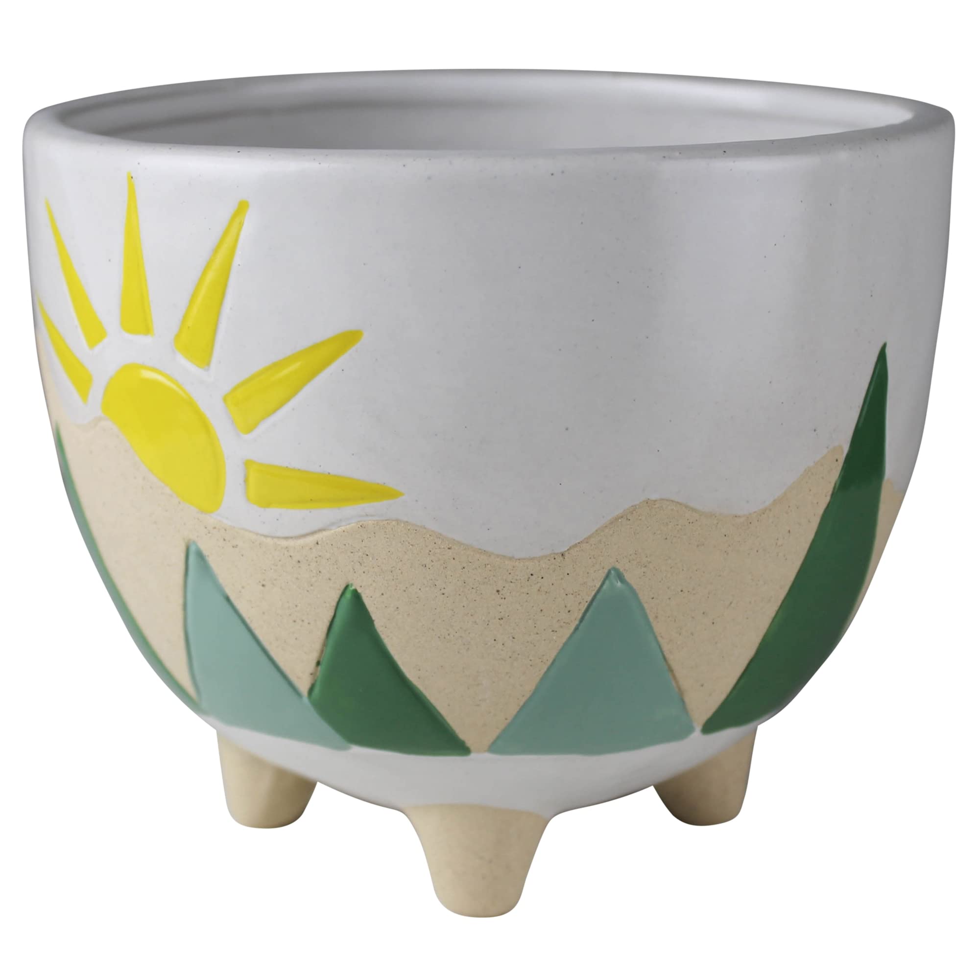 Bring the beauty of the outdoors inside with this stunning Mountain Plant Pot! Featuring a serene yellow sun, white background, and green and blue mountains, this pot captures the tranquility and grandeur of nature. Perfect for showcasing your favorite plants, it adds a peaceful, nature-inspired touch to any room.