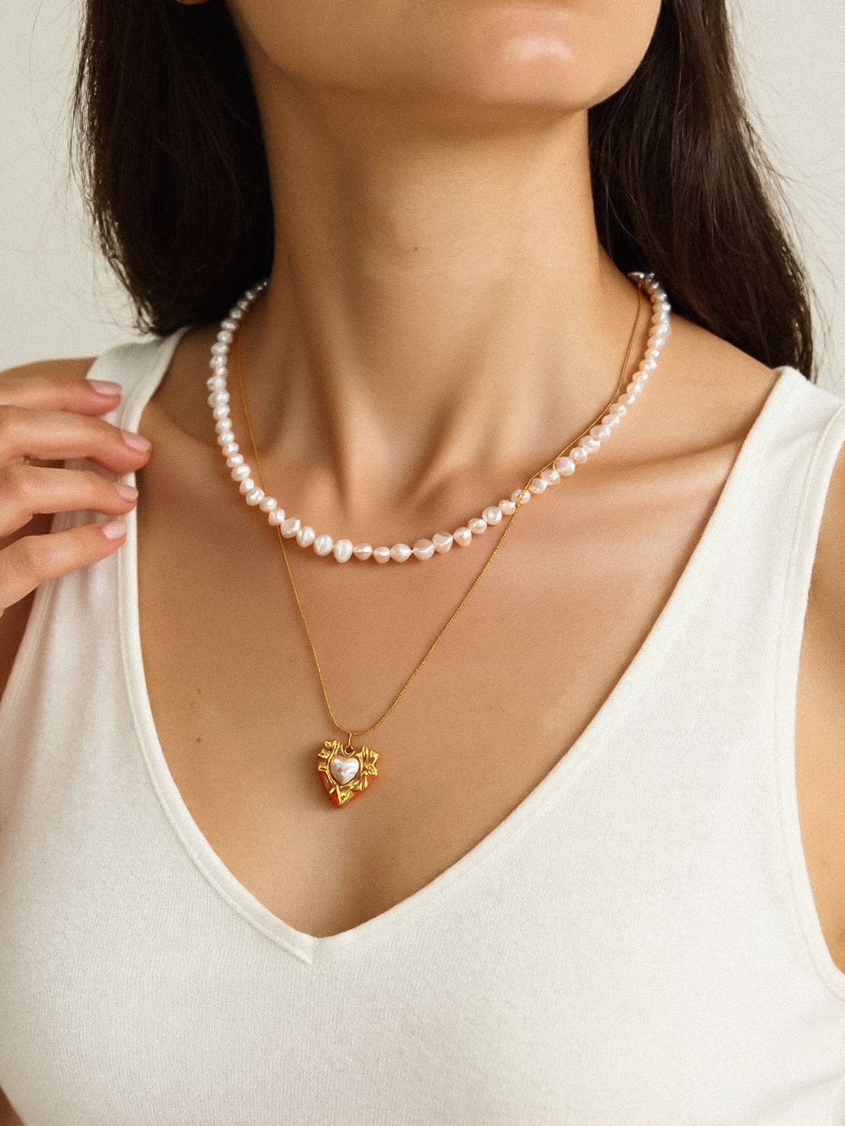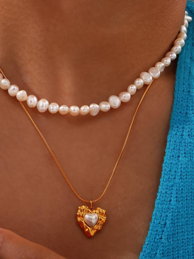 18K Gold Non-Tarnish Layered Pearl Heart Necklace