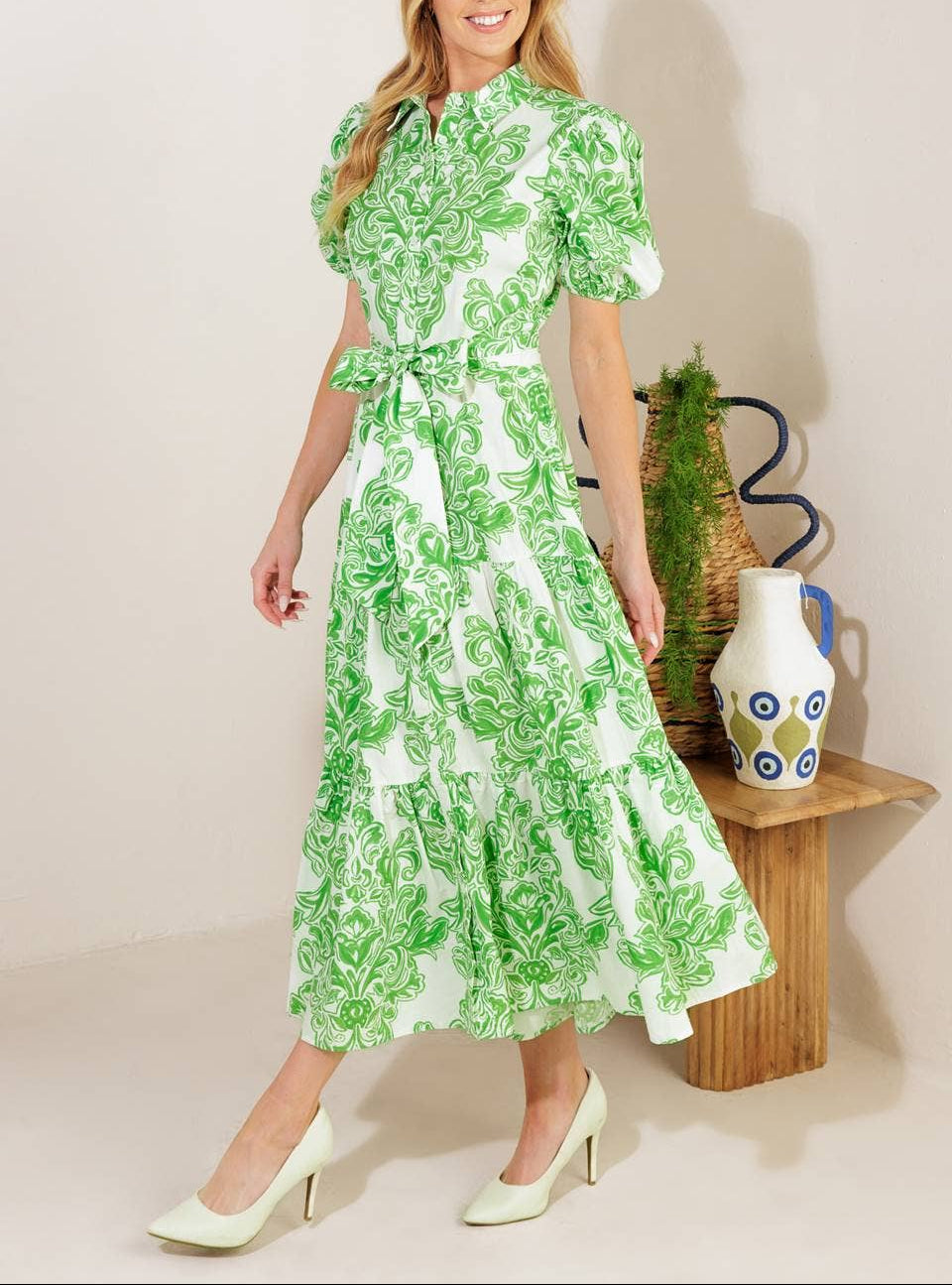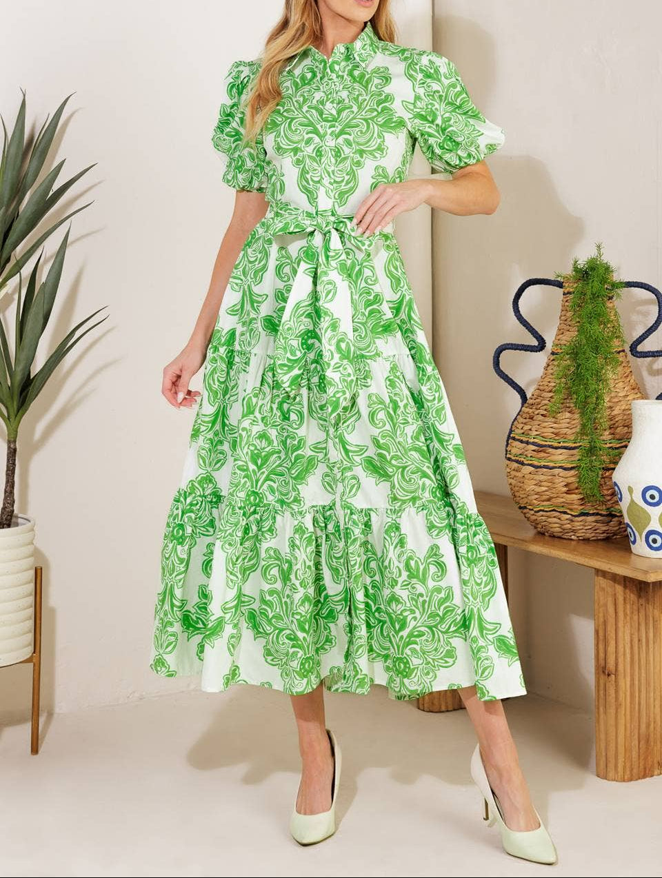 A printed woven midi dress crafted from 100% cotton, featuring a classic shirt collar, button-down front, short puff sleeves, a self-tie sash, and a tiered skirt.