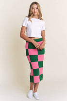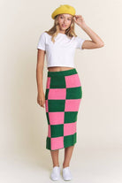 BIG CHECKERED PAST KNIT PENCIL MIDI SKIRT W/ SIDE SLIT