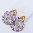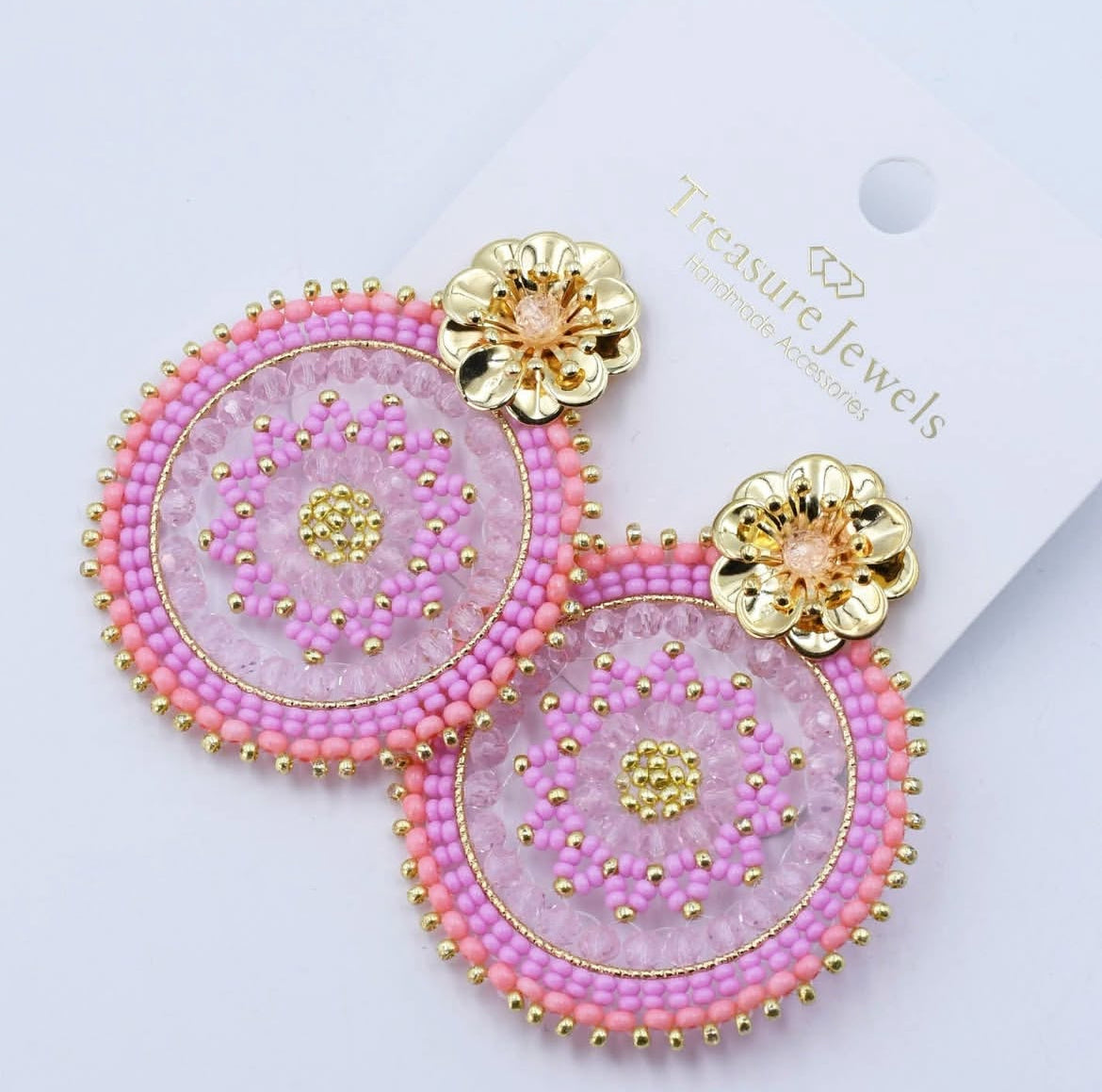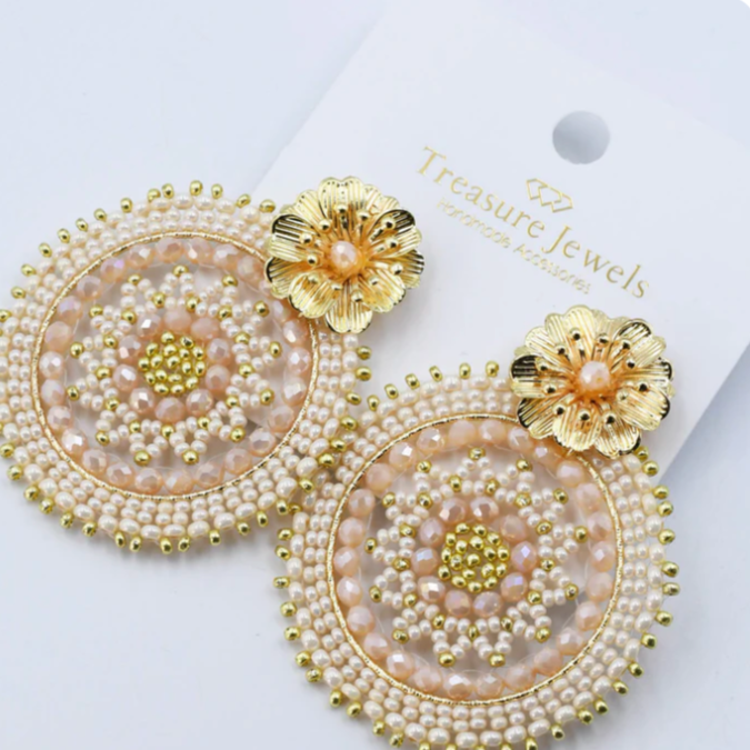 Graceful and refined, these earrings blend floral elegance with intricate beadwork. A delicate gold flower stud, centered with a soft light pink bead, anchors this stunning design. Suspended below is a beautifully crafted flat beaded circle, interwoven with white, gold, and nude pink beads for a soft yet sophisticated contrast. Handmade in Colombia, these earrings are a perfect balance of timeless charm and artisanal craftsmanship.