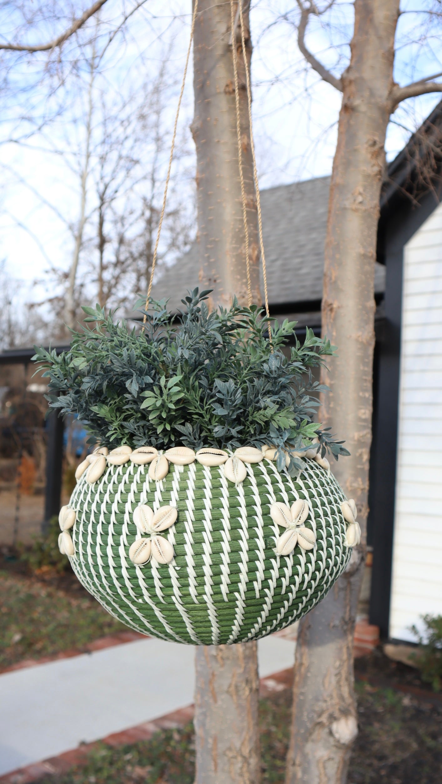 Elevate your greenery with this enchanting hanging basket planter, wrapped in deep forest green rattan and accented with delicate white string for a touch of artisanal charm. A border of smooth white shells encircles the rim, with additional shell details adorning the body, creating a coastal-meets-woodland aesthetic. Designed to cradle a planter rather than hold soil directly, this piece brings texture and natural elegance to any space, whether suspended indoors or swaying gently in the breeze on a patio.