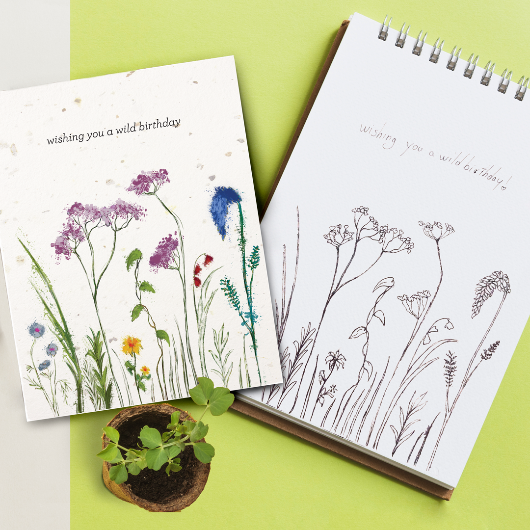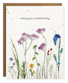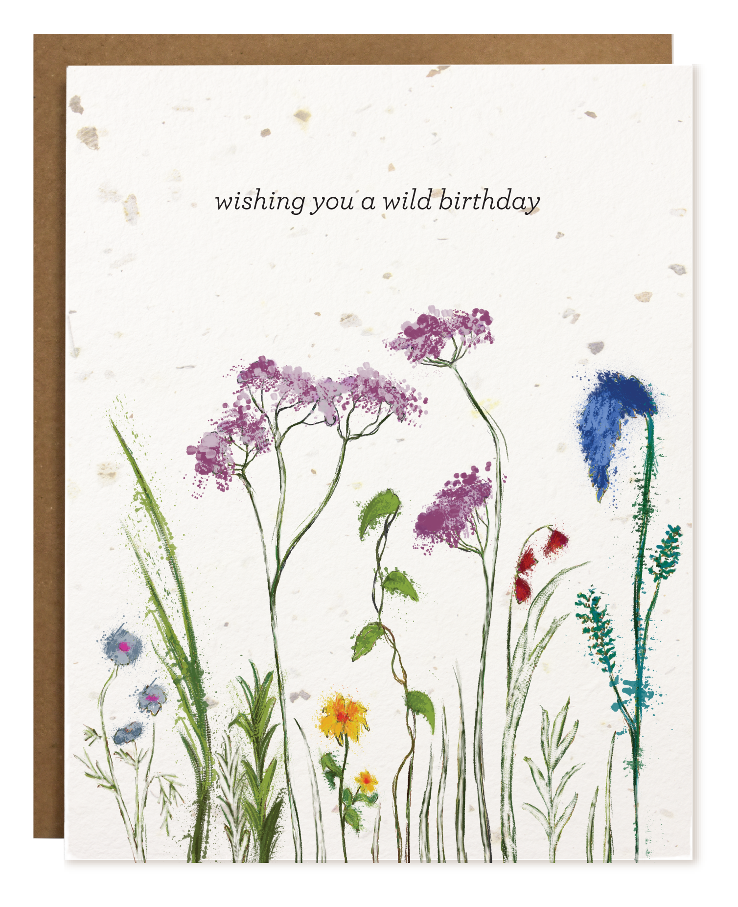 Send someone a wild birthday card printed on our wildflower seeded plantable paper. - Inside: Blank - A2 size (4 1/4" x 5 1/2") - Recycled Kraft Paper Envelope - Printed on Handmade Seeded Paper - Plastic Free Packaging* WILDFLOWER MIX: Baby Blue Eyes, Black-Eyed Susan, Candytuft, Catchfly, Corn Poppy, English Daisy, Five Spot, Gloriosa Daisy, Scarlet Flax, Siberian Wallflower, Sweet William Pinks, Tall Spurred Snapdragon, and Zinnia *As we navigate this exciting transition into our new eco-conscious brand TOKA, you may notice some variation in our products and packaging.
