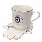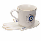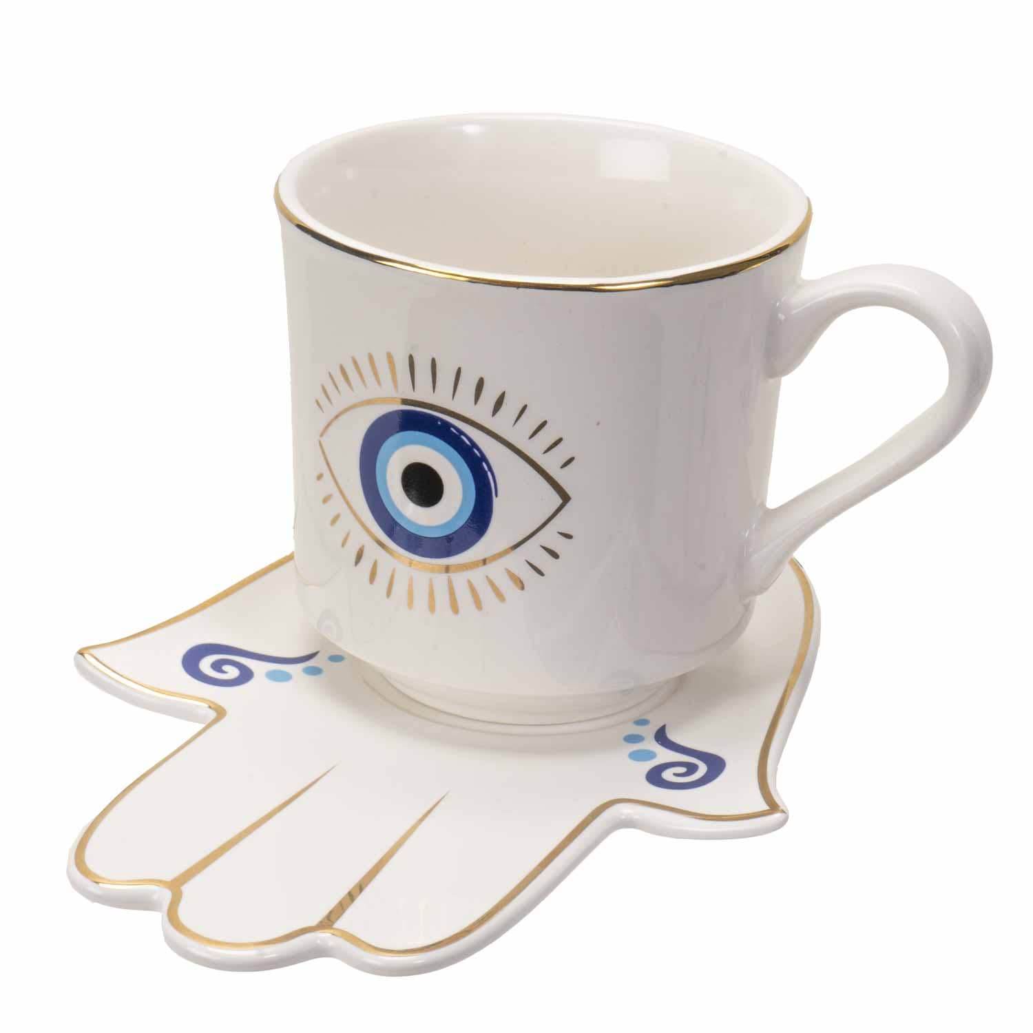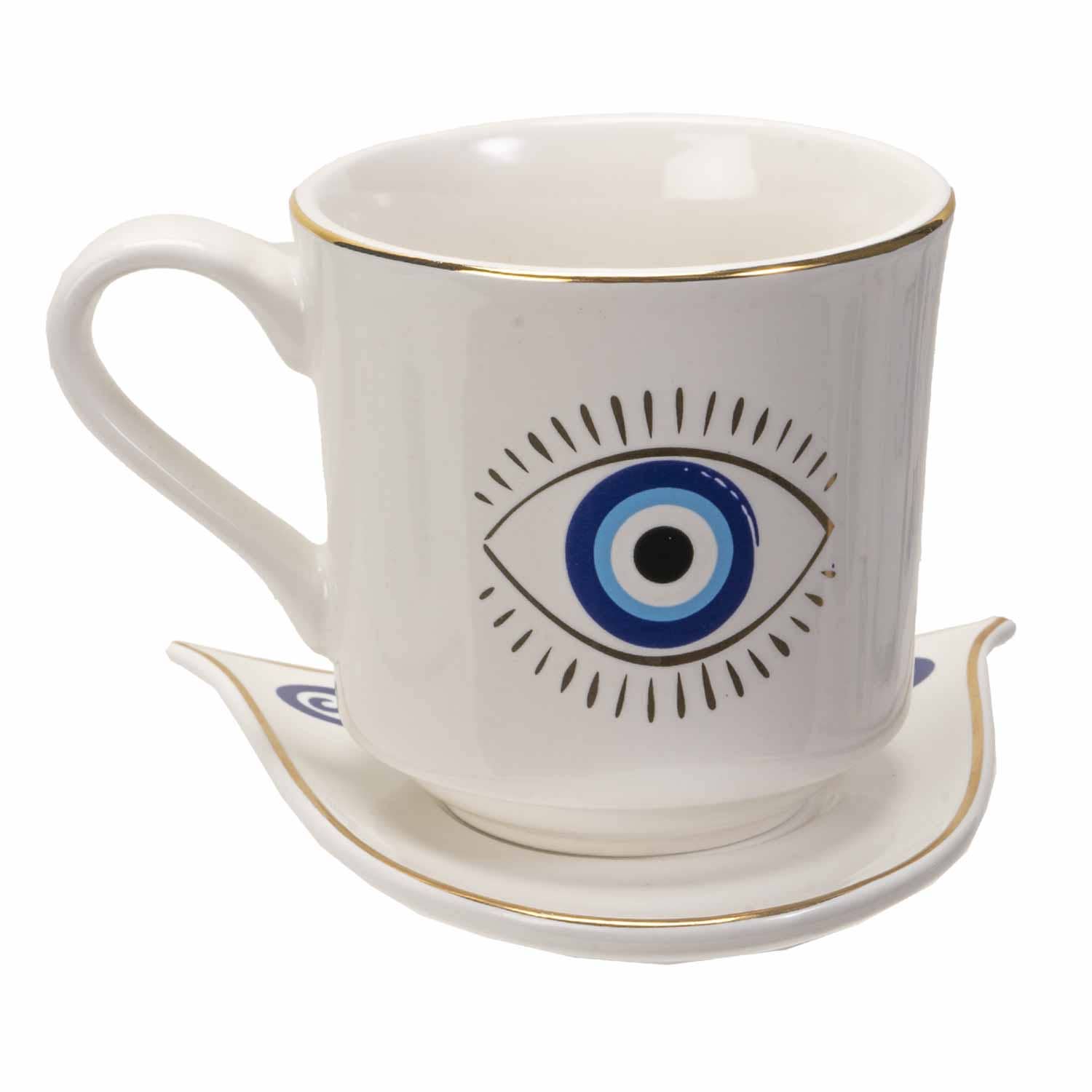 All Seeing Eye Cup and Saucer Set White Product Size: 4.4" X 2.75" X 3.2" Cup Capacity: 7oz Material: Stoneware/Glaze (Not Microwave Safe)