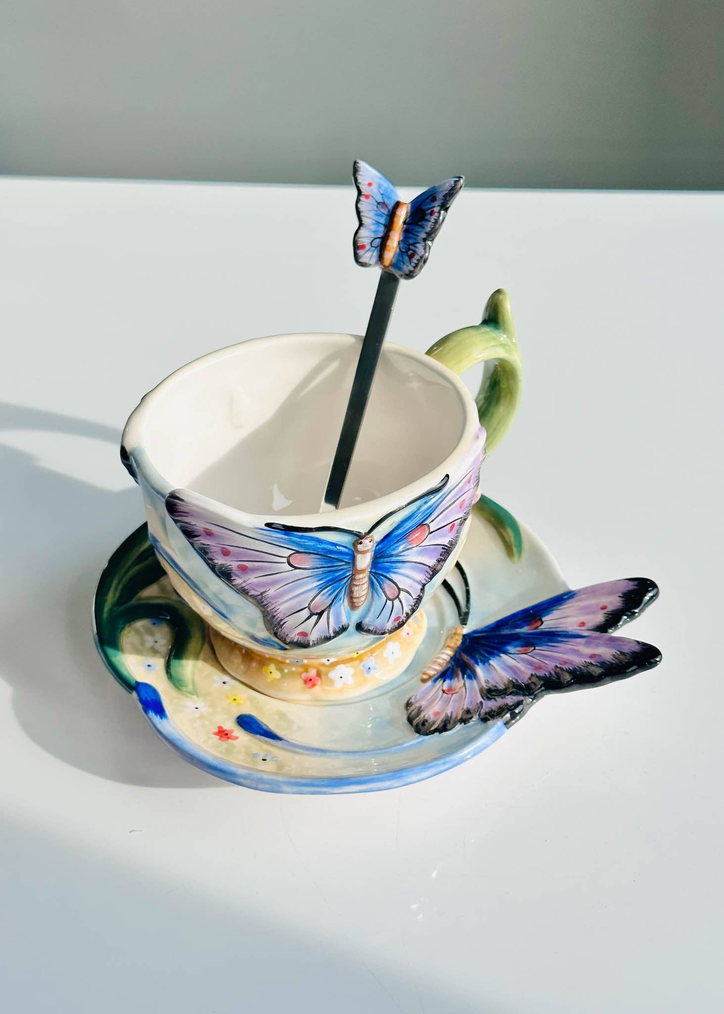 Bring a little bit of springtime to your home every morning with this gorgeous butterfly mug, saucer, & spoon set🦋