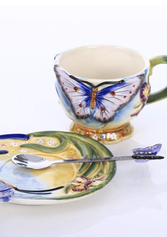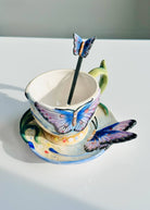 The butterfly-topped spoon will make you feel like a fairy as you stir in your cream & sugar, and the beautiful saucer helps to catch all spills