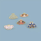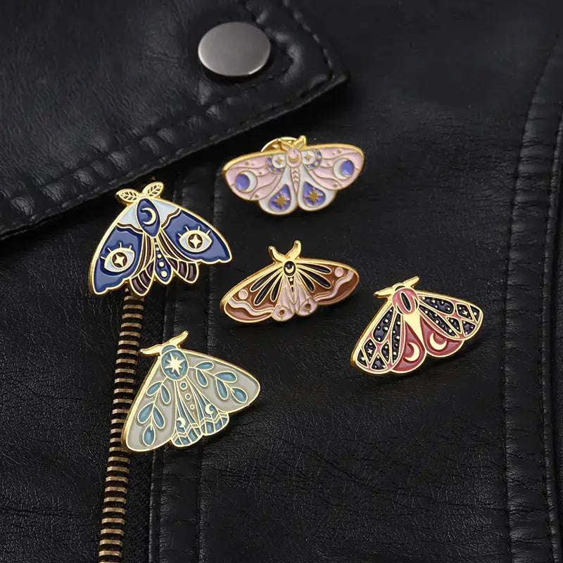 Unique floral moth butterfly enamel pins Custom insect brooches for lapel and clothing Eye-catching gothic moon design Perfect for nature-loving kids and friends Make a statement with these beautiful pins A great gift for any occasion Durable and long-lasting construction Quality craftsmanship and attention to detail Random mix - Lower priced option. Can have a mix of any of the 5 pins.