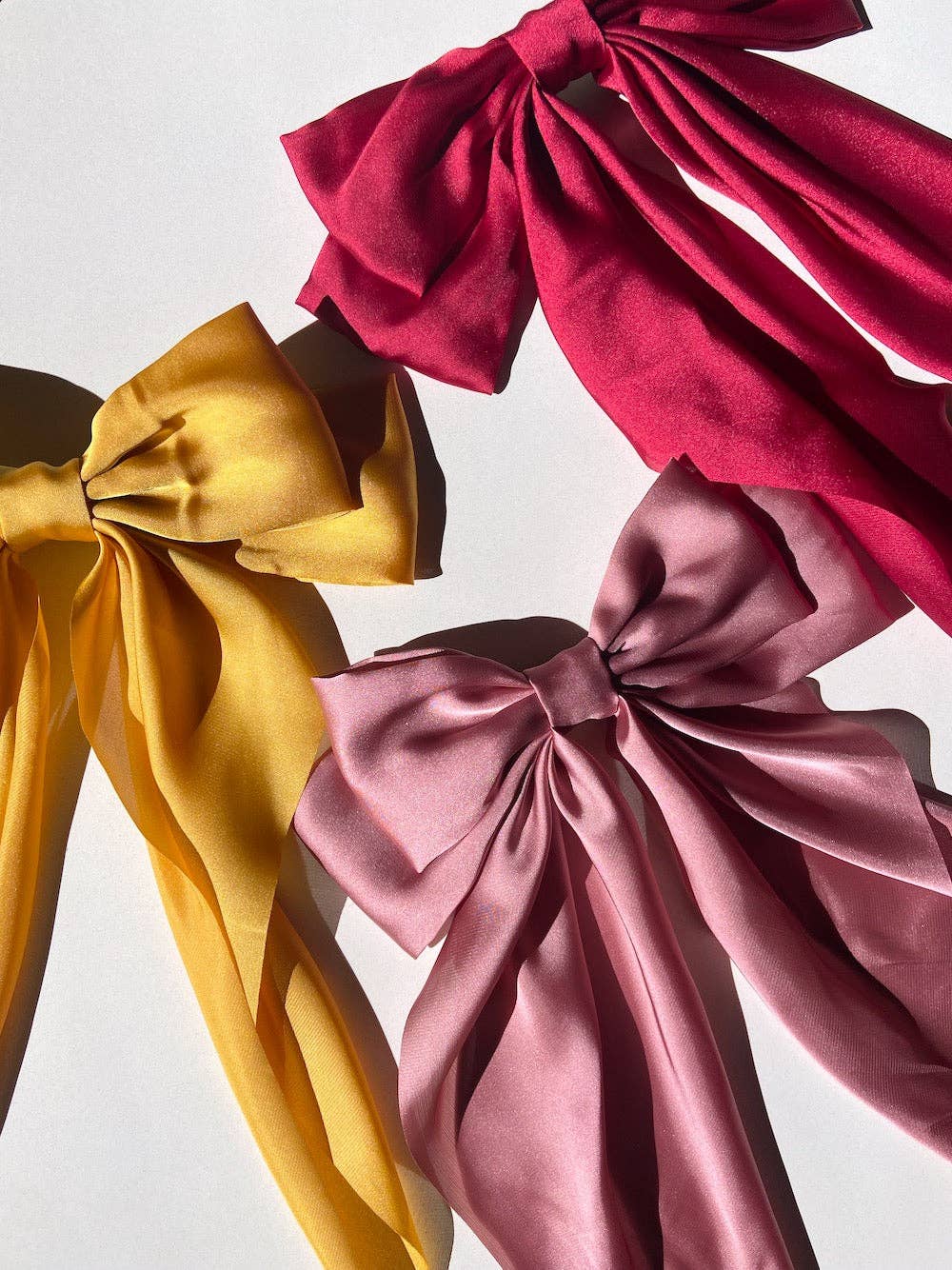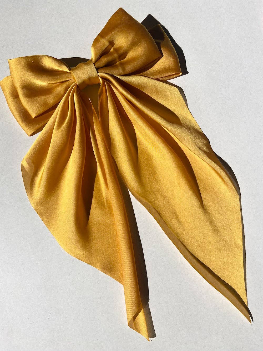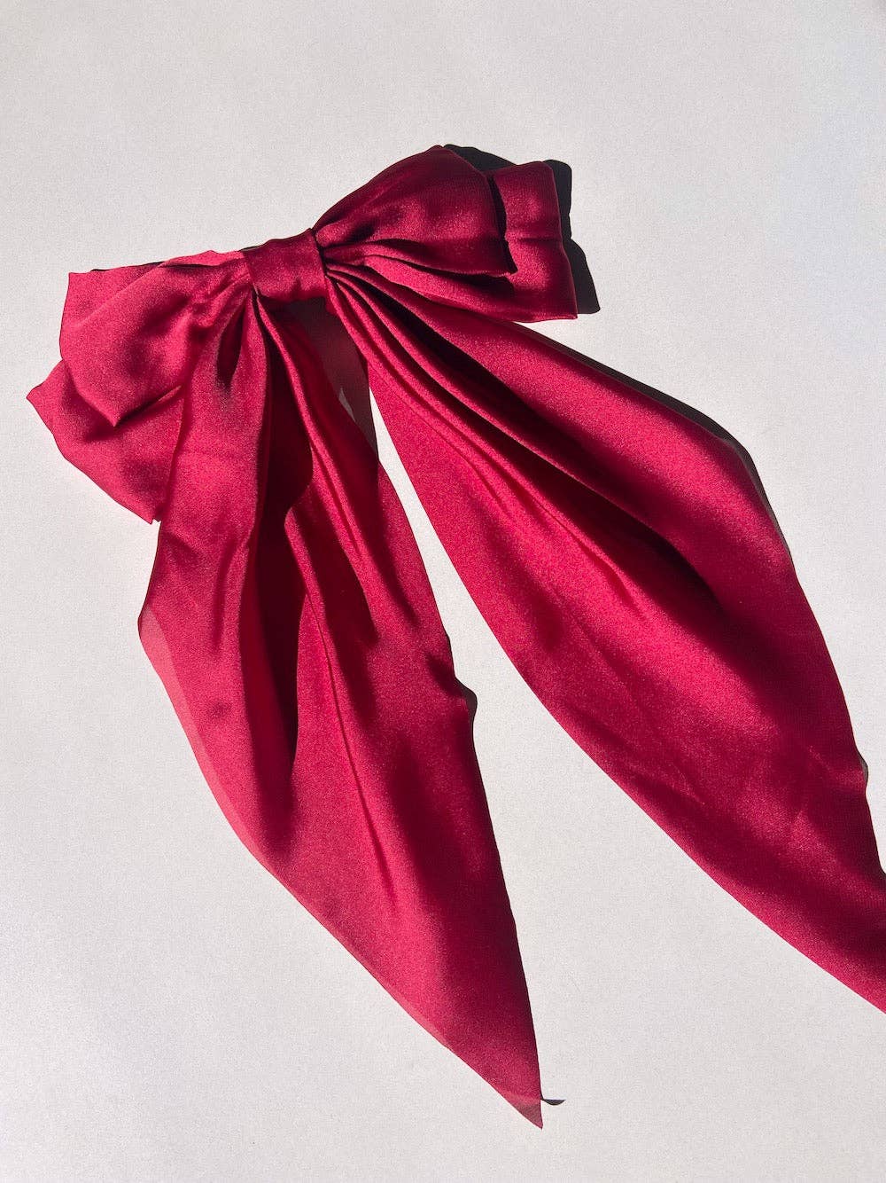 *Trending* Style notes - satin bow - hand-knotted bow - french barrette clip - Imported Plastic-Free Packaging - Solar Eclipse dust bag - retail cards + care instructions Dimensions Bow - 16" length; 9" width Barrette - 3.5" Materials I'm carefully crafted from premium satin.