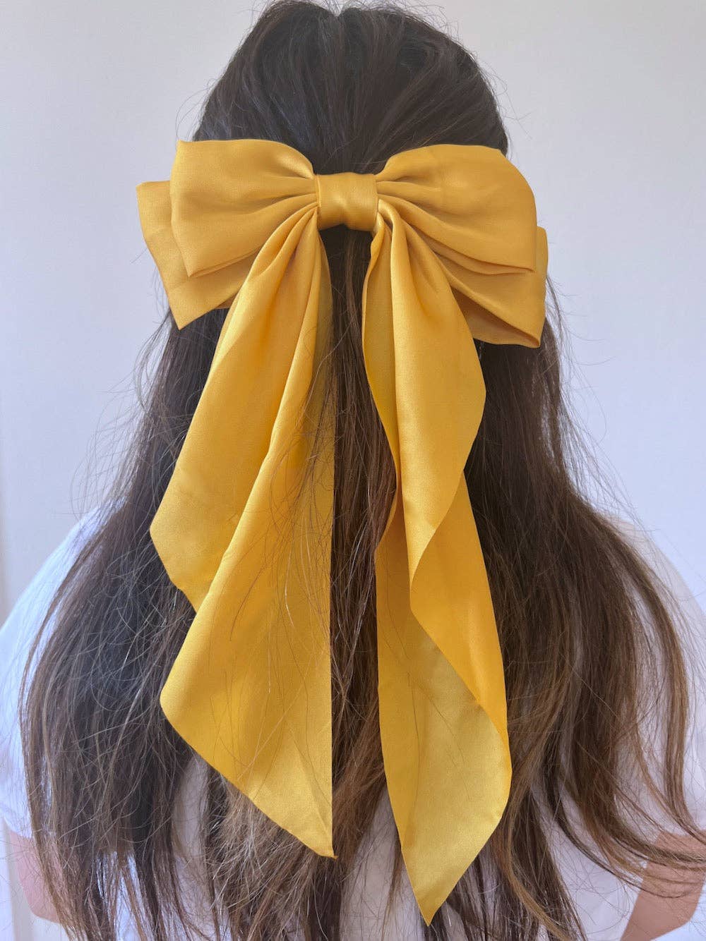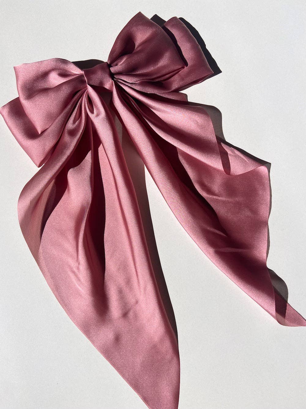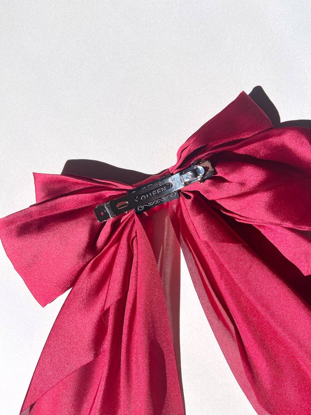 *Trending* Style notes - satin bow - hand-knotted bow - french barrette clip - Imported Plastic-Free Packaging - Solar Eclipse dust bag - retail cards + care instructions Dimensions Bow - 16" length; 9" width Barrette - 3.5" Materials I'm carefully crafted from premium satin.