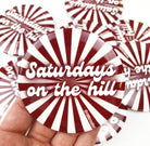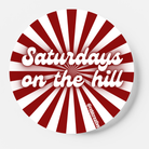Each pin back button is 3 inches in diameter. These buttons are super lightweight and perfect for Game Day! Add to your outfit or a purse strap to complete your game day look. Each button is finished with a plastic coating to keep your button clean from any game day activities!