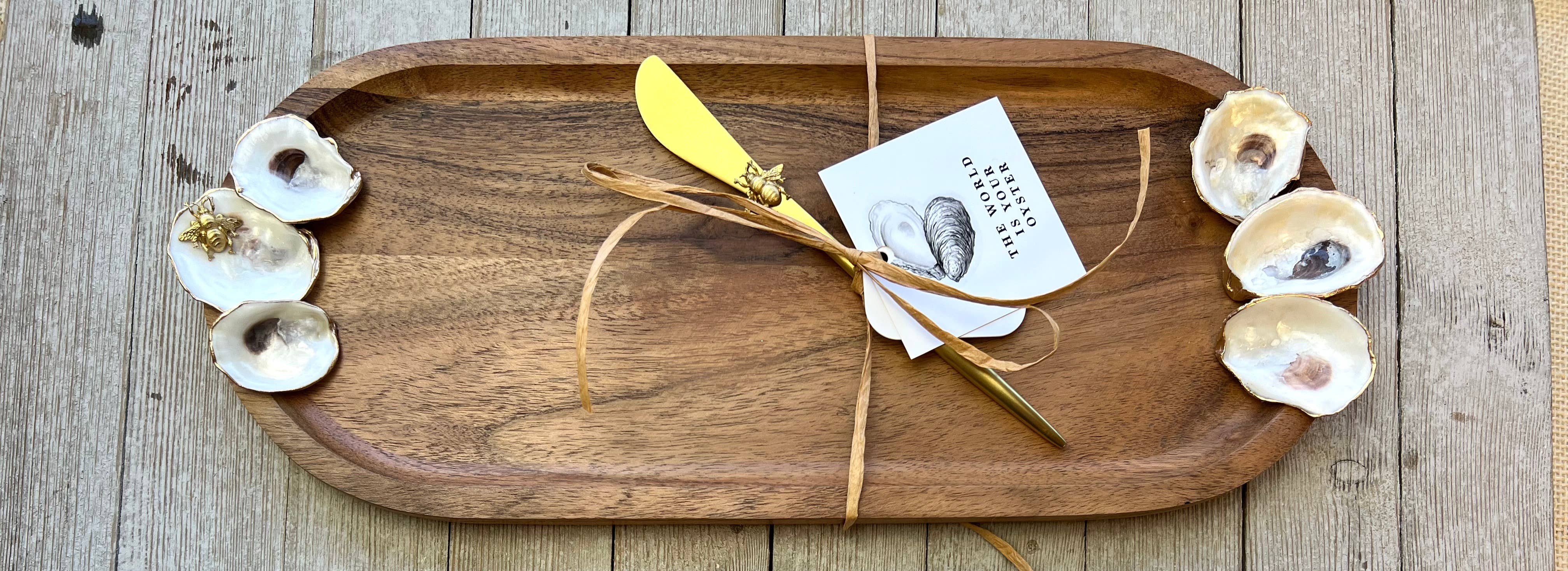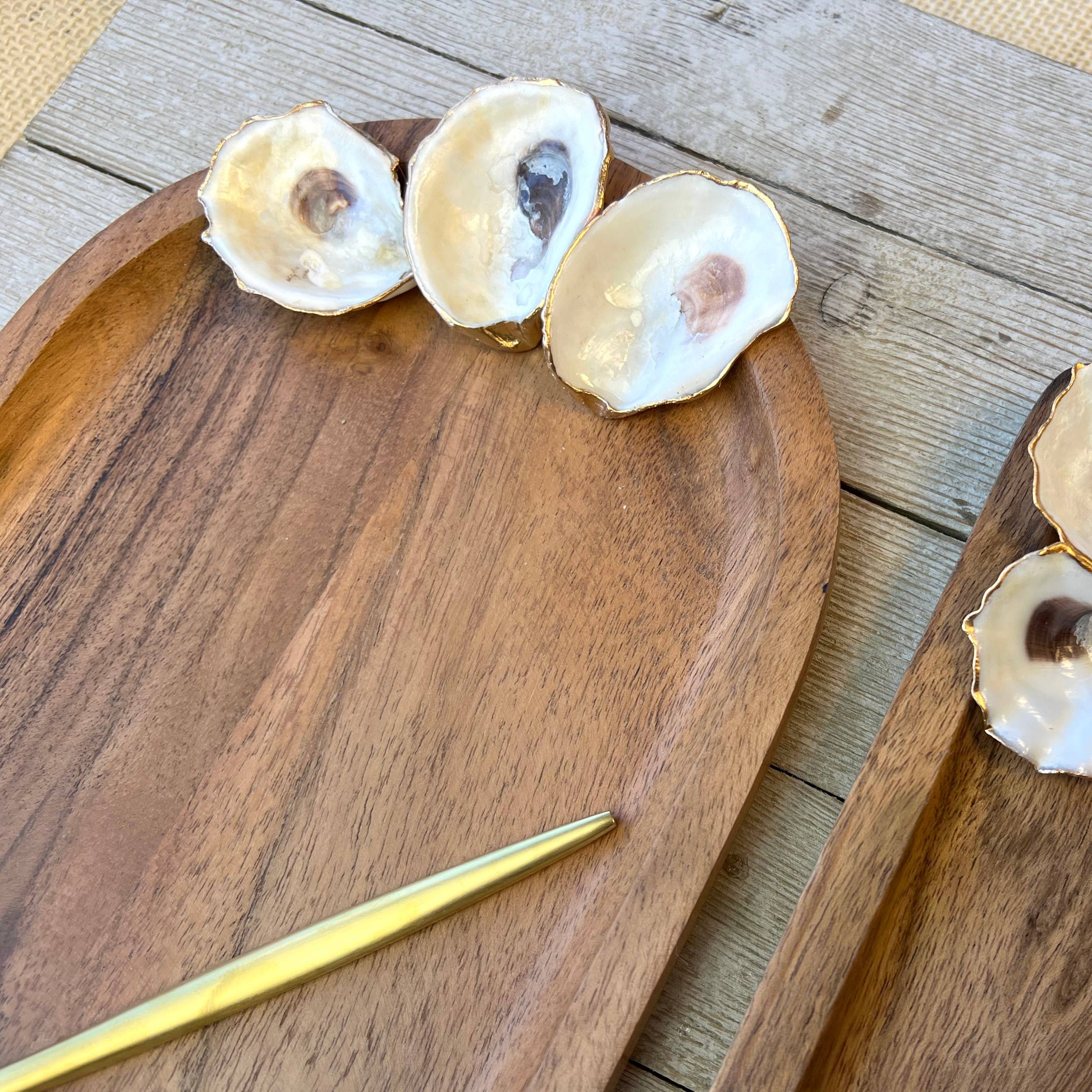 Elevate your entertaining with this exquisite oval wooden serving board, designed for stylish appetizer and charcuterie presentations. Six delicate oysters—three on each side—adorn the board, their natural beauty enhanced by gilded rims, while a charming gold bee accent adds a touch of elegance. Crafted from warm, richly grained wood, this 14” x 6” tray is both functional and artful. Complete with a coordinating gold cheese knife featuring a bee detail, it’s the perfect centerpiece for serving cheeses, fruits, and small bites with sophistication.