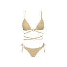 Dazzle under the sun with this gold shimmer swimsuit set, designed to make every beach and poolside moment unforgettable. The set includes a sleek triangle top with adjustable straps and high-rise bikini bottoms that elongate the silhouette. The fabric features a subtle, light-catching shimmer that glistens beautifully with every movement. Whether lounging or taking a dip, this set brings a touch of luxury and glamour to your swimwear collection.