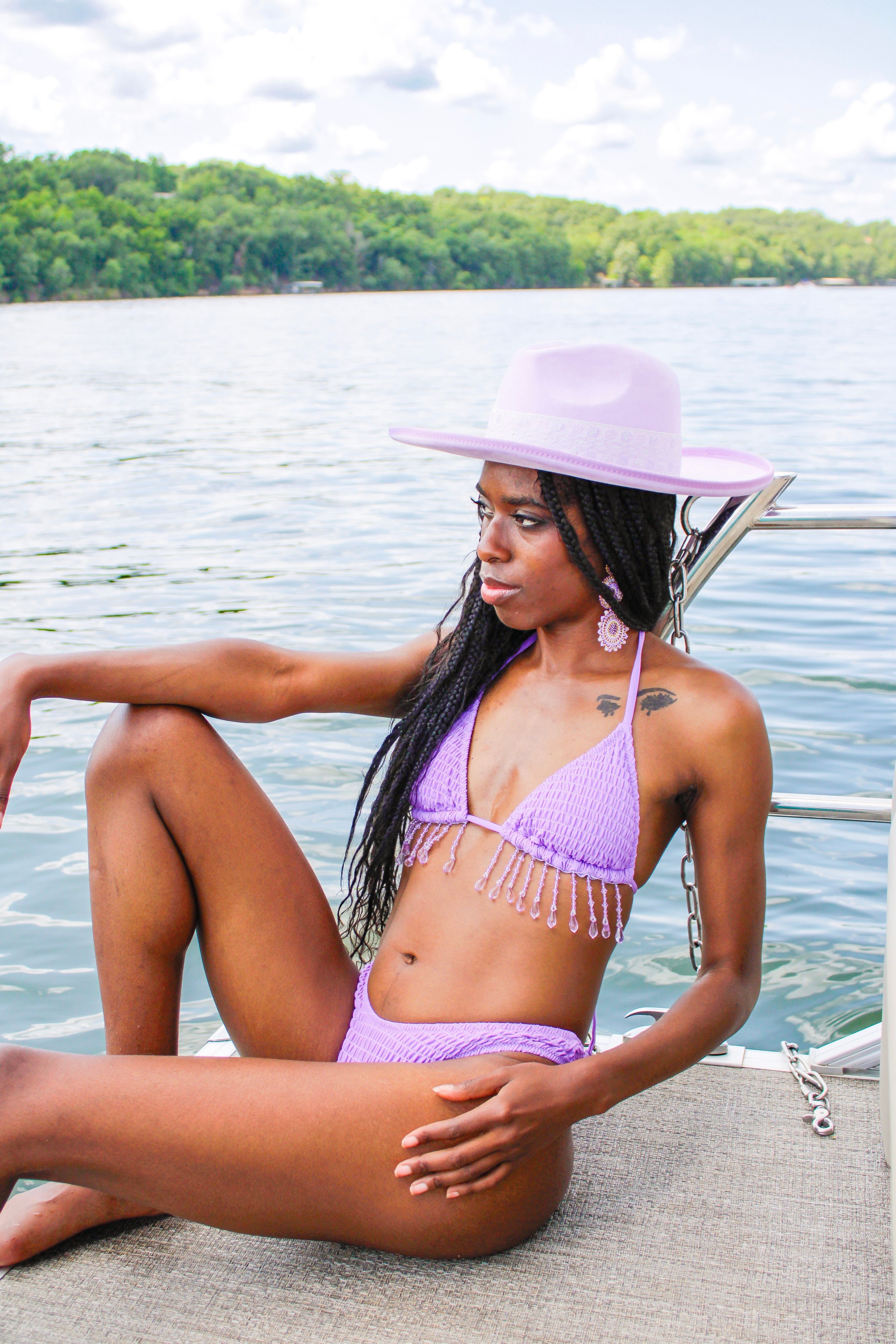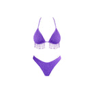 This bikini set features a rich purple hue, reminiscent of ripe grapes. The textured fabric and fringe details on the top evoke the delicate image of raindrops, creating a playful and elegant look.