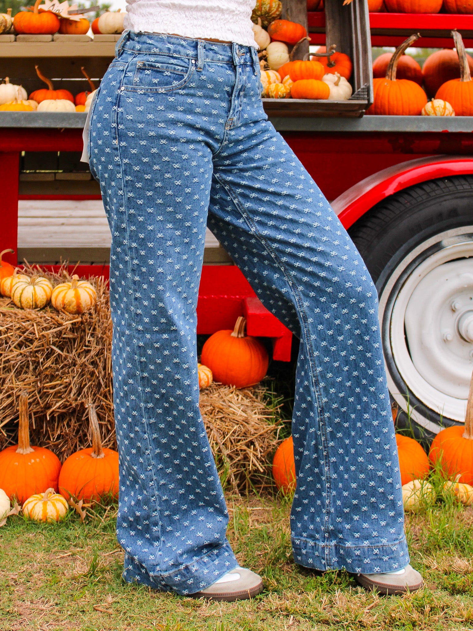 These statement denim jeans bring a playful twist to a classic silhouette. Crafted in a medium-wash blue, they feature an allover white bow pattern that adds a subtle yet eye-catching charm. Designed with a flattering high-rise waist and a relaxed wide-leg fit, these jeans offer both comfort and style. The structured denim holds its shape while still feeling easy to wear, making them perfect for casual days, seasonal outings, or dressing up with a cozy knit. Equal parts whimsical and wearable, these jeans are made to stand out without trying too hard.