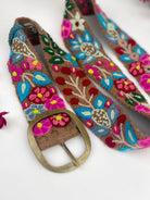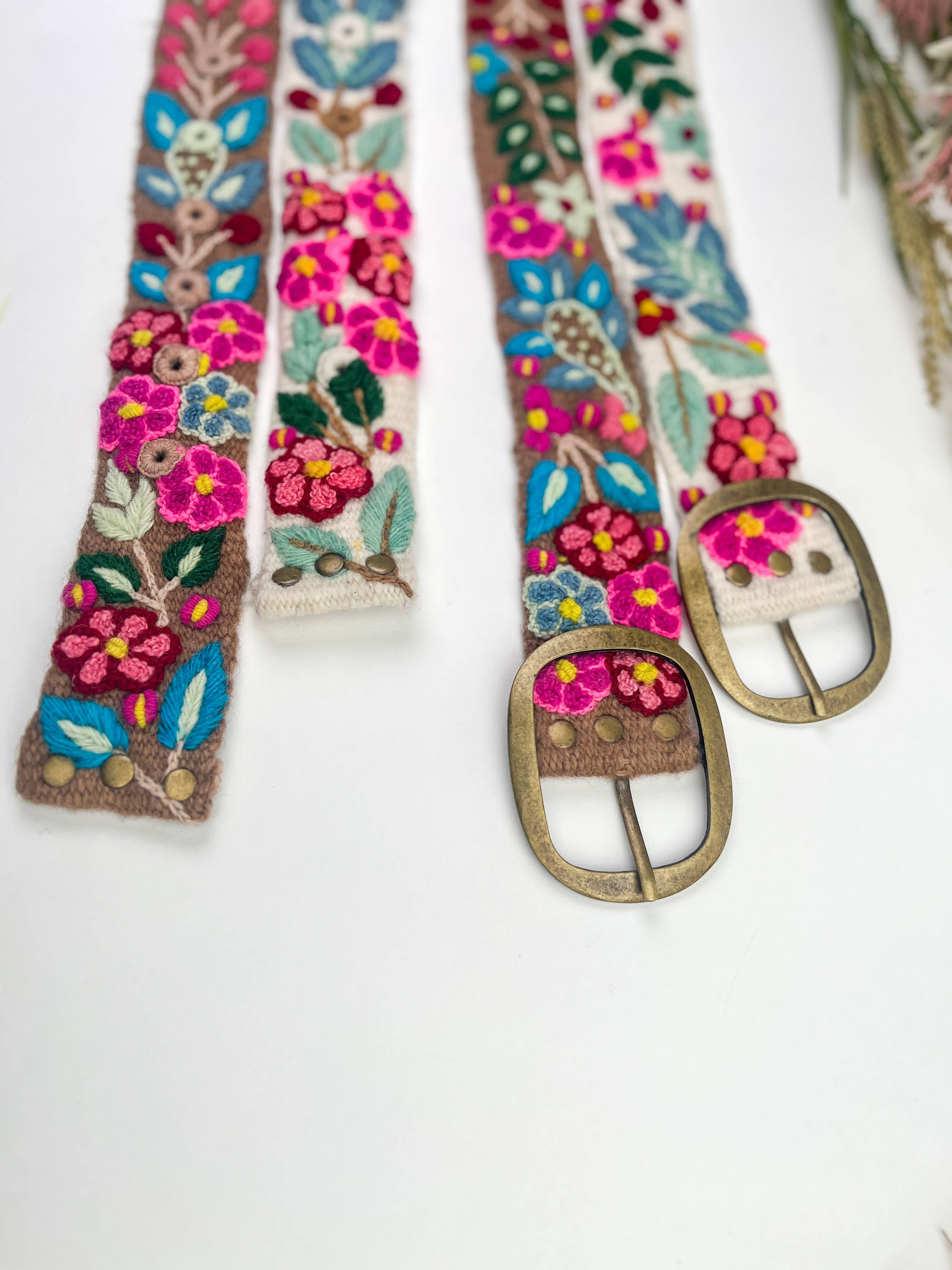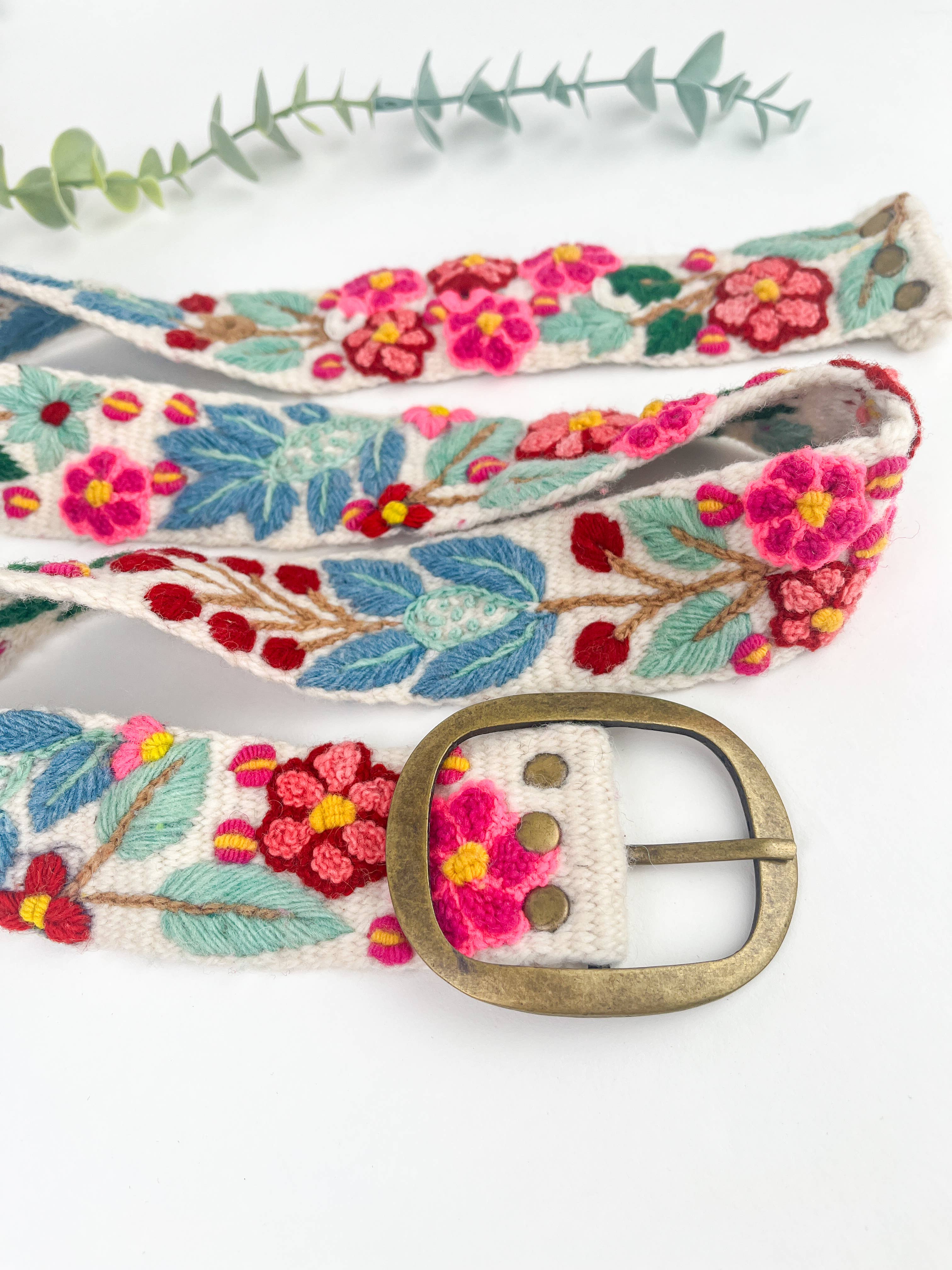 The belts have multiple holes and can be worn in the waist or hip, whichever you prefer! • Wool material • Width: 2 in. • Hand embroidered design • Metal buckle • Handmade in Peru Each piece embodies not just the exquisite craftmanship, but also the vibrant spirit of the Andean artisan community. This product sustains their livelihoods and preserves traditions.