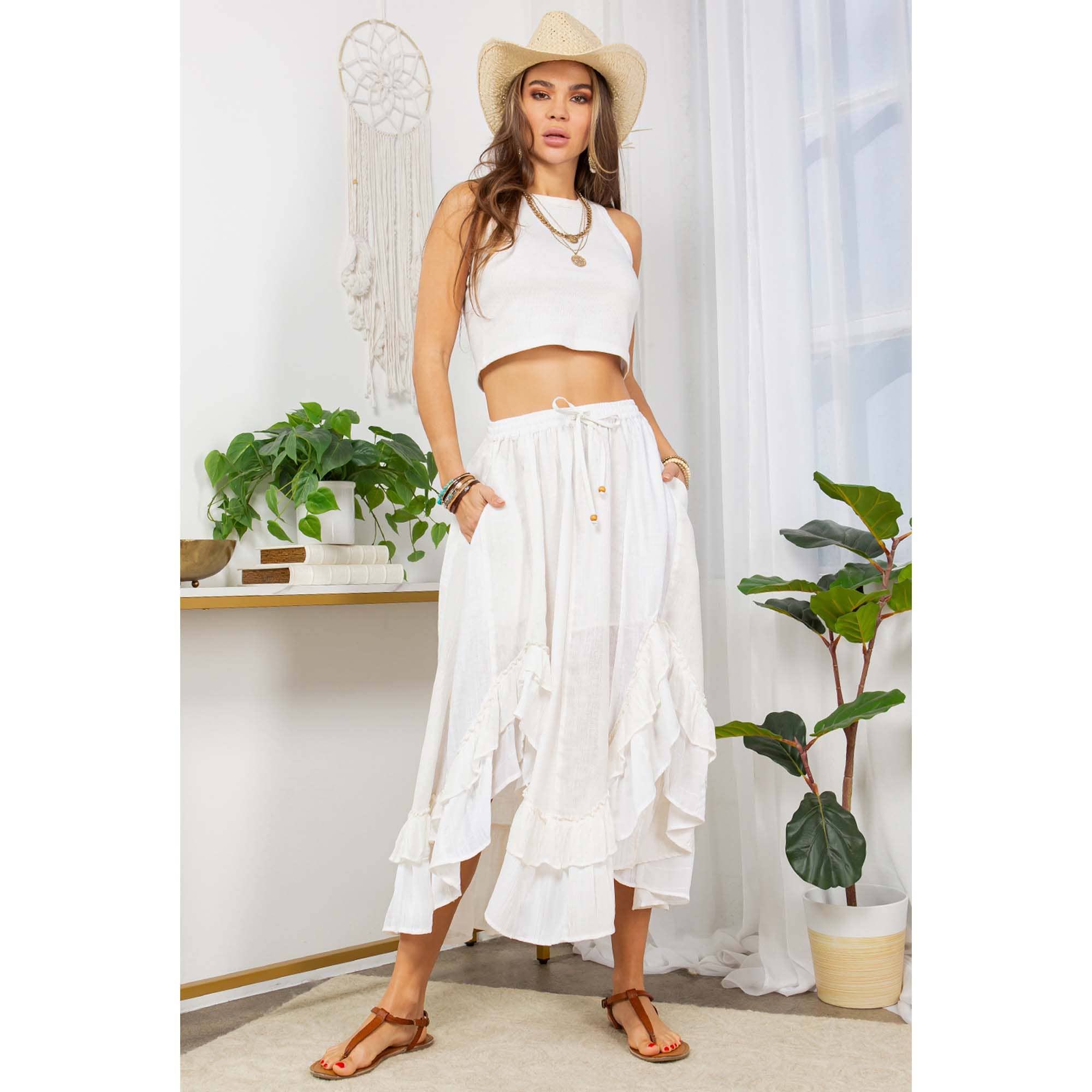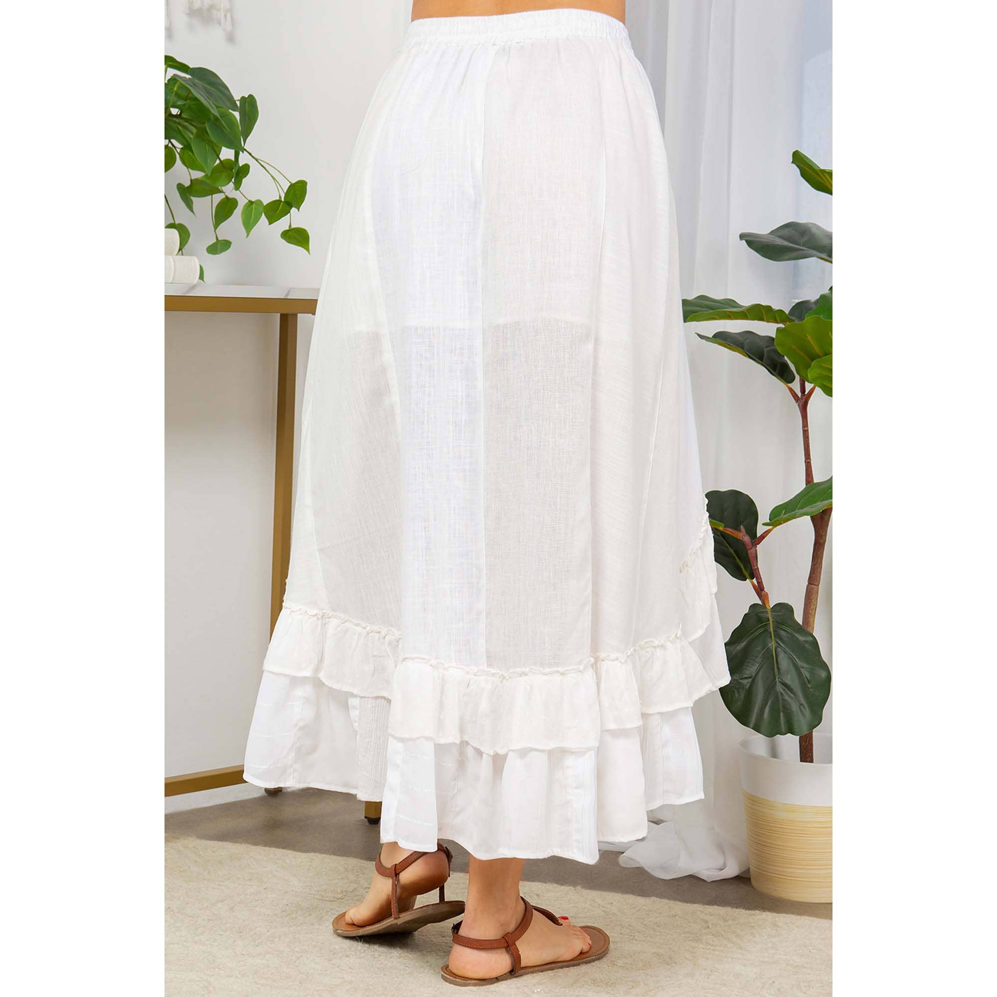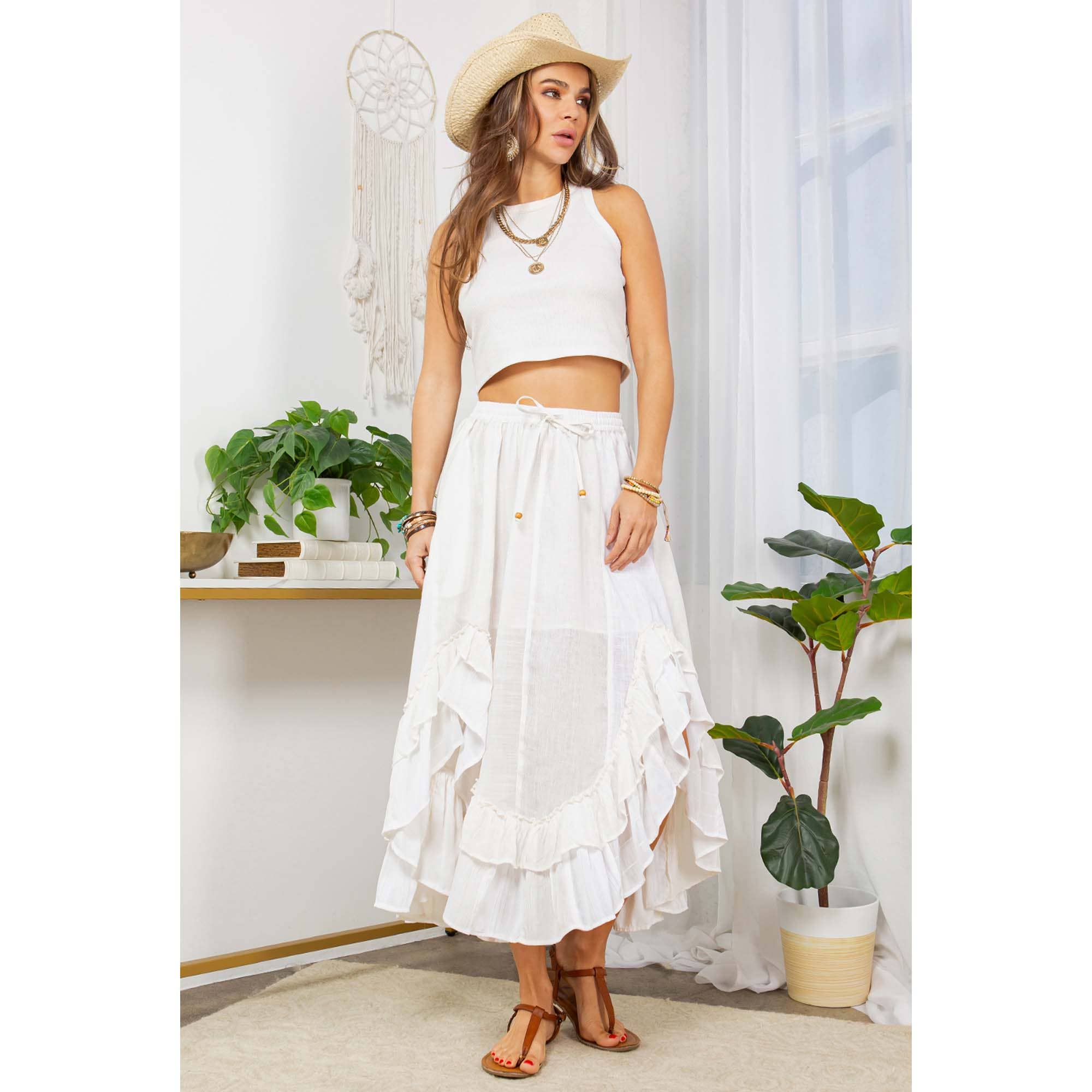 Embrace the whispers of the West in this captivating mid-length skirt, where a symphony of textured poly-linen patches dances together in a celebration of bohemian spirit. Inspired by the adventurous caravan riders of the 70s, this skirt features a clean, symmetrical silhouette with vertical panels. Each panel showcases a unique textured poly-linen fabric, creating a visually stunning patchwork masterpiece. The skirt culminates in a playful double yo-yo like frill detail around the bottom, adding a touch of movement and feminine charm. Washed to a crisp white tone, this garment embodies the free spirit of the 70s, offering a modern take on a timeless bohemian aesthetic. Pair it with your favorite top and let your inner western rider roam free.