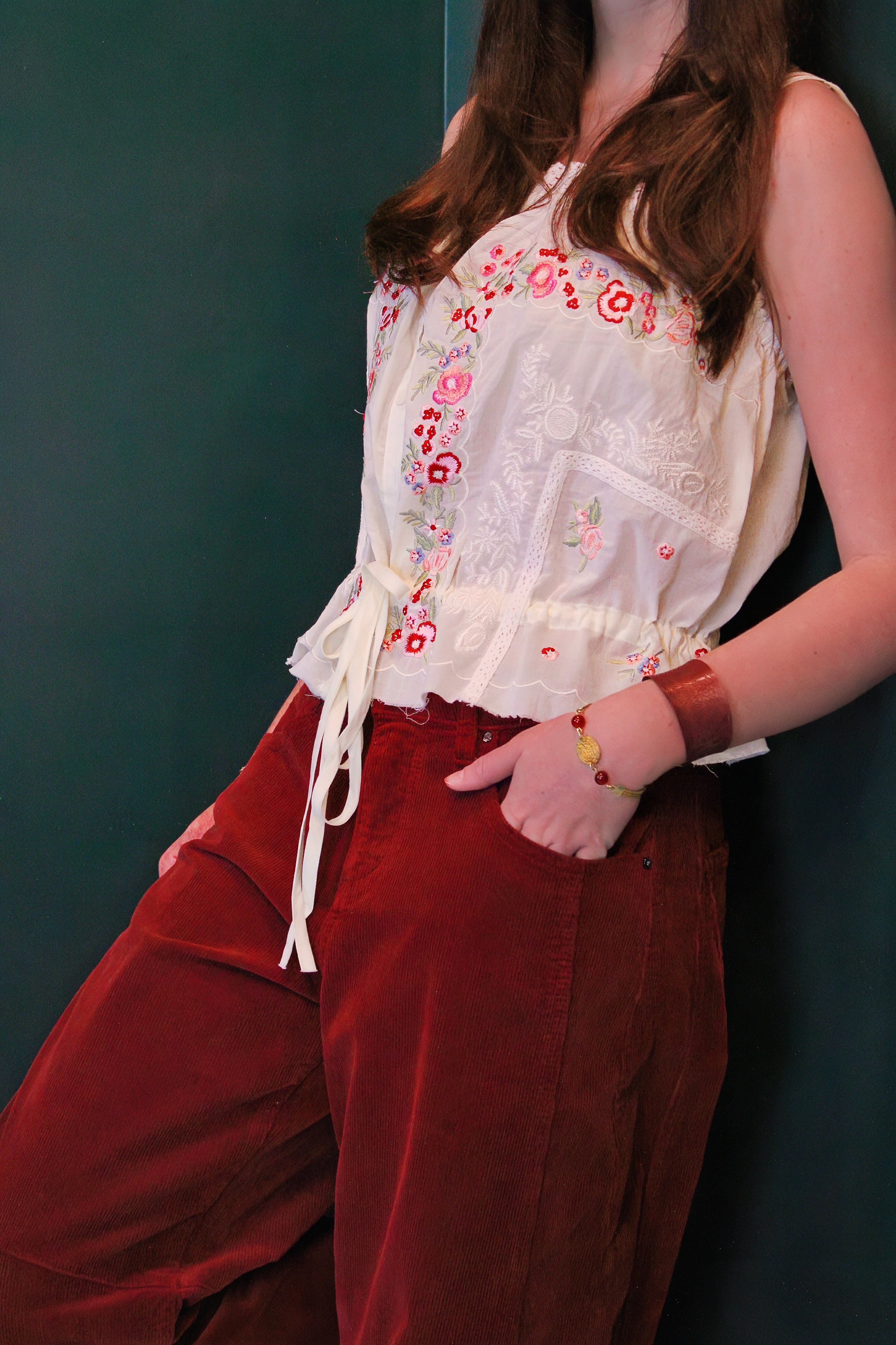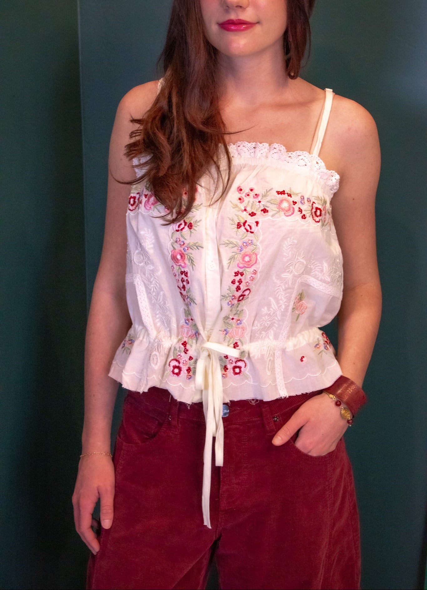 This delicate white top features intricate floral embroidery in soft pinks and reds, accented with fine lace detailing for a feminine, vintage feel. The lightweight fabric drapes gently, while the adjustable waist tie creates a flattering, softly cinched silhouette. Or you can loosen the tie for a more airy fit. Slim shoulder straps and a scalloped lace neckline add an elegant finishing touch.