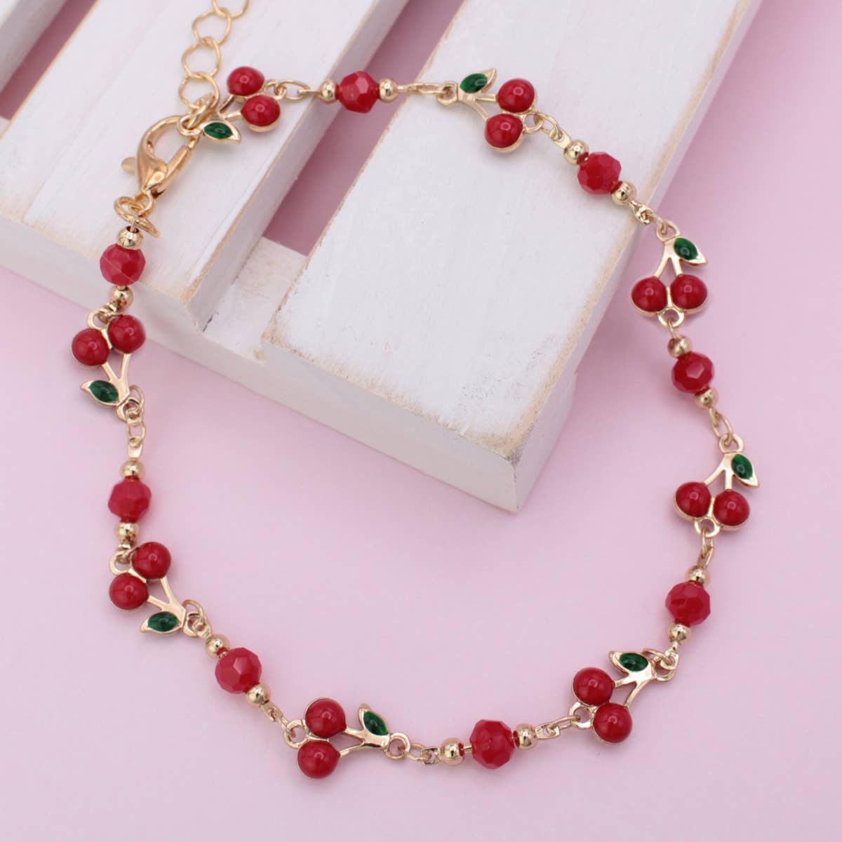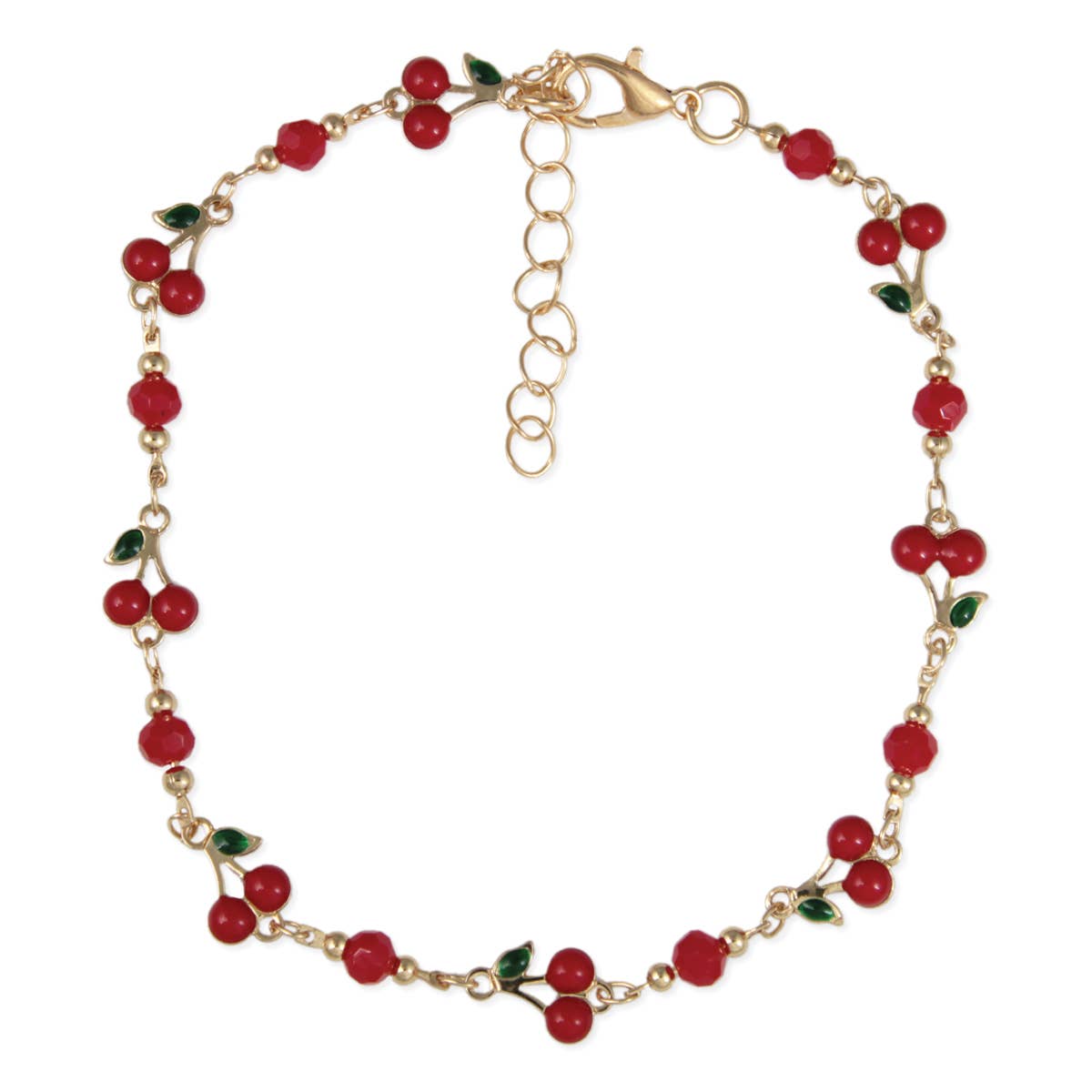 Sweeten your look with this adorable gold and enamel cherry link anklet. Featuring dainty cherry-shaped links with glossy red enamel and faceted red beads, this playful piece adds a juicy pop of color to any outfit. Perfect for sunny days, picnics, or whenever you’re feeling a little extra sweet.