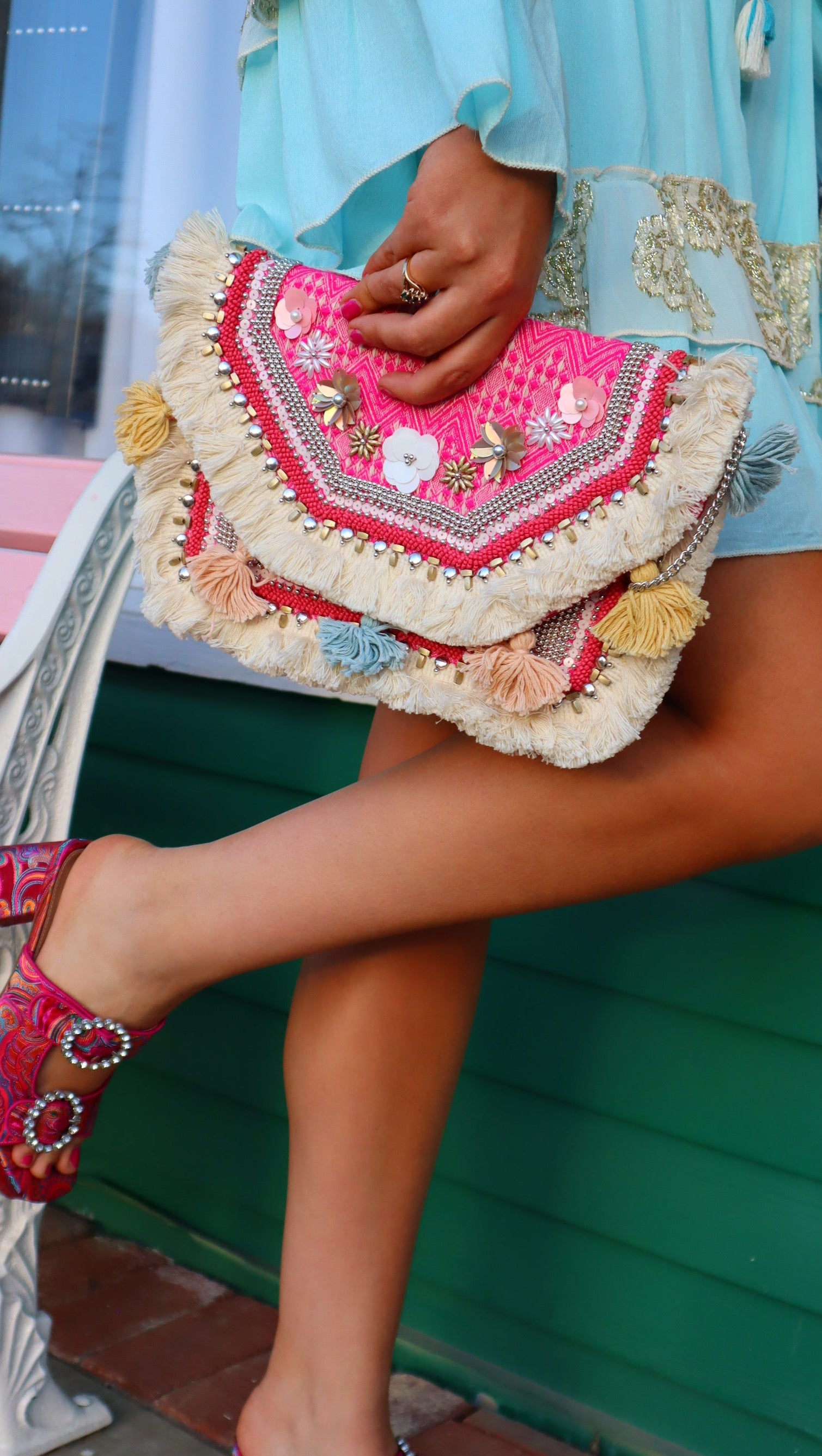 Pink Cream Fringe Tassel Large Jute Clutch