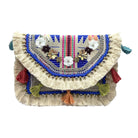 Pizzazz, Inc. presents a captivating Blue with Cream Fringe and Multi Colored Tassel Large Clutch, a perfect accessory for the fashion-forward woman. This clutch, like all our products, is a testament to the skill and artistry of Indian artisans. Each bag takes 2-3 days to craft, ensuring uniqueness in design. The blend of beautiful fabrics from Northern India, such as Cotton, Jacquard, Jute, Silk, and Wool, adds to its charm and distinction. This clutch is not just an accessory; it's a statement of style and sophistication.