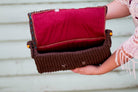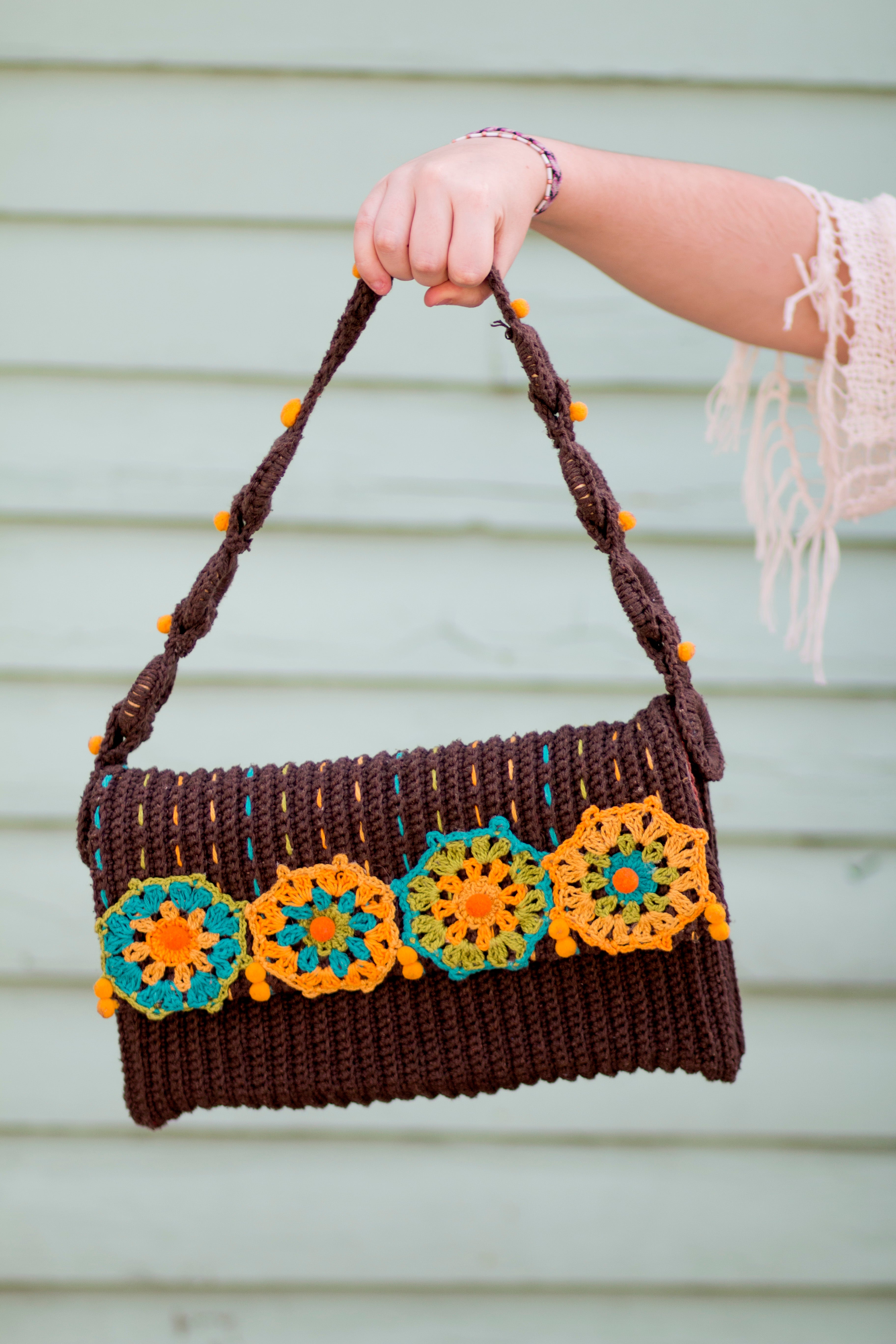 Add a splash of vibrant Brazilian flair to your wardrobe with this one-of-a-kind crochet purse, handmade in Rio de Janeiro! This unique brown bag features intricate orange, green, and turquoise crocheted accents, playful pompom details, and a sturdy O-ring strap. The flap closure with magnetic clasps ensures your essentials stay secure, while the bold red lining adds a touch of surprise.