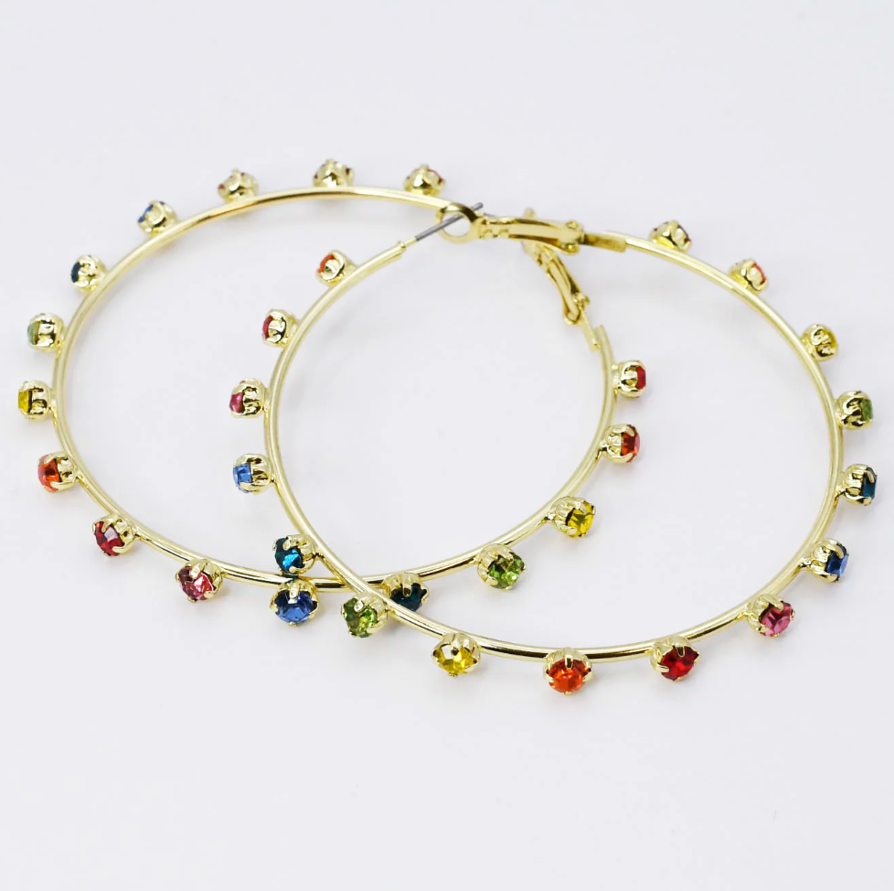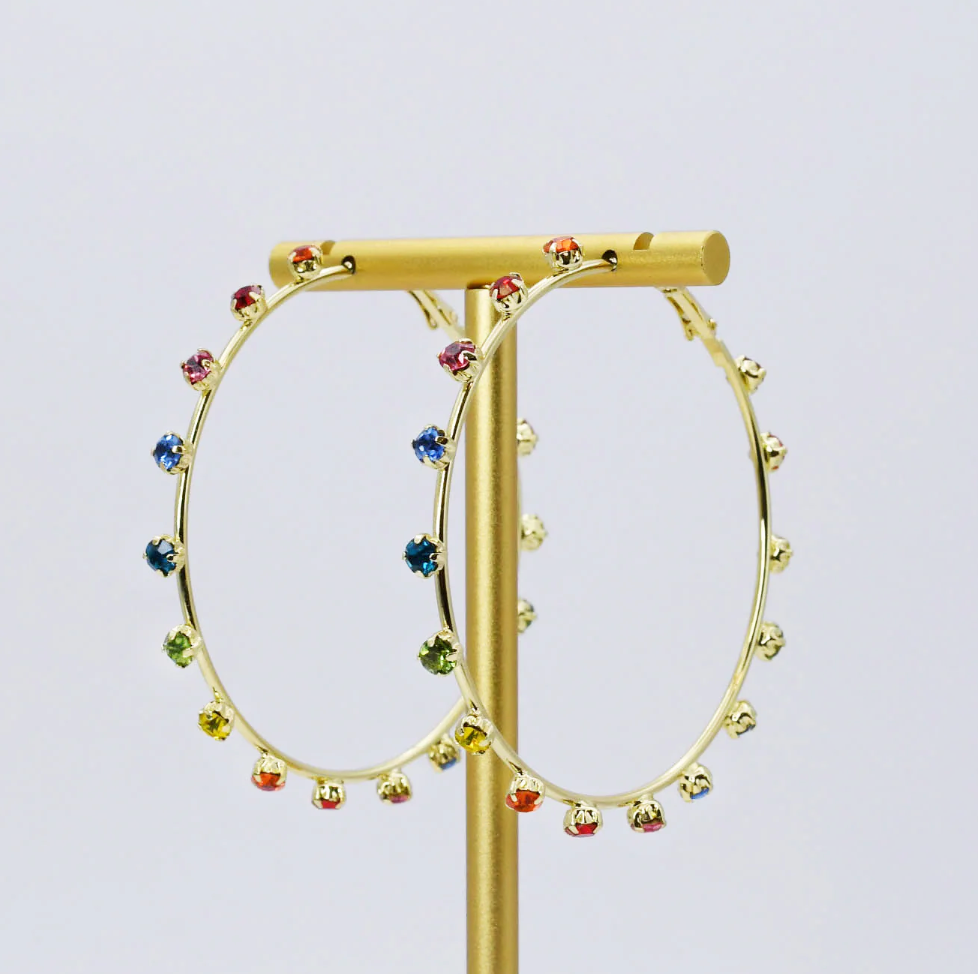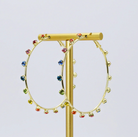 A perfect blend of classic elegance and vibrant color, these gold hoop earrings feature a stunning lineup of rainbow-hued gemstones. Each gem is carefully spaced about a centimeter apart, creating a refined yet playful aesthetic that catches the light beautifully. Whether adding a subtle pop of color to everyday outfits or complementing a bold look, these earrings are the perfect mix of sophistication and fun. Handmade in Colombia, they celebrate expert craftsmanship and timeless design.