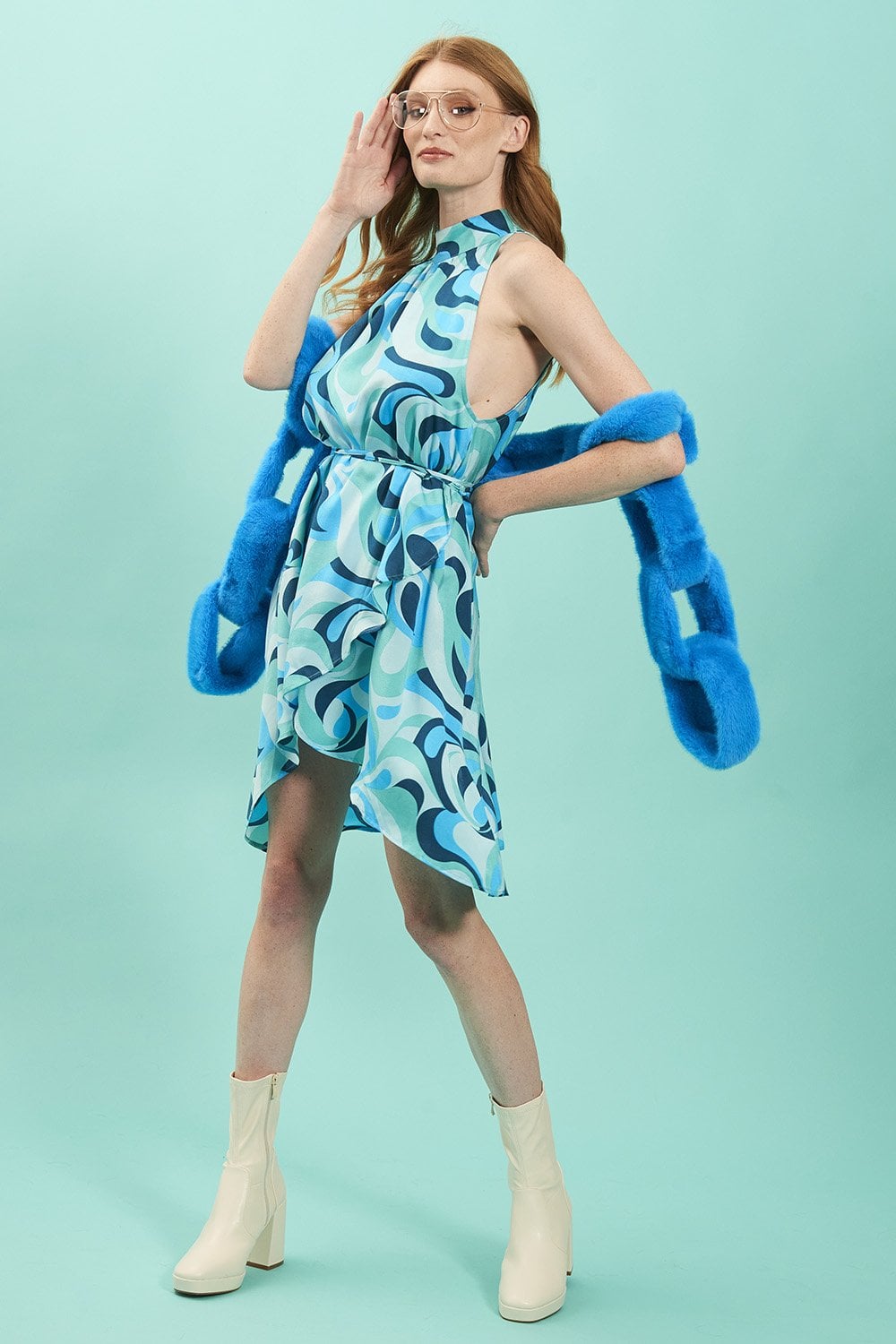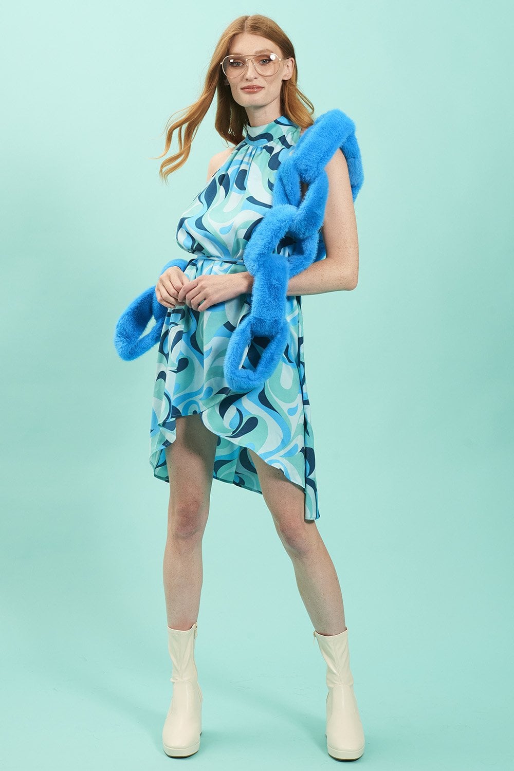 Elevate your outfit with our super soft blue faux fur scarf is the perfect way to add a pop of color to your outfit, featuring a unique chain detailing. Comes with a matching large blue faux fur heart-shaped removable pompom (not pictured).