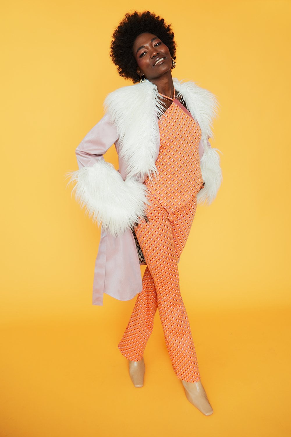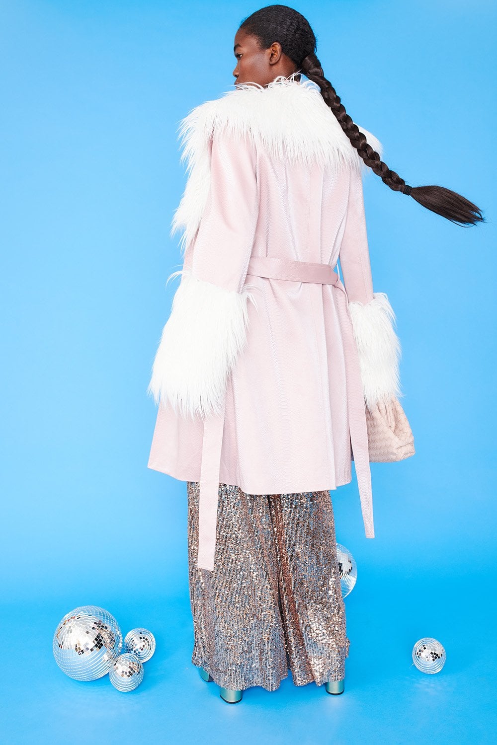 Make a bold statement with this knee-length faux snakeskin jacket, a perfect blend of edgy glamour and vintage-inspired luxury. The light pink snakeskin, kissed with a metallic sheen, catches the light beautifully, while the plush Mongolian fur trim at the collar and wrists adds a dramatic, textural contrast. Sleek yet extravagant, this coat is designed to turn heads and keep you effortlessly chic.