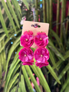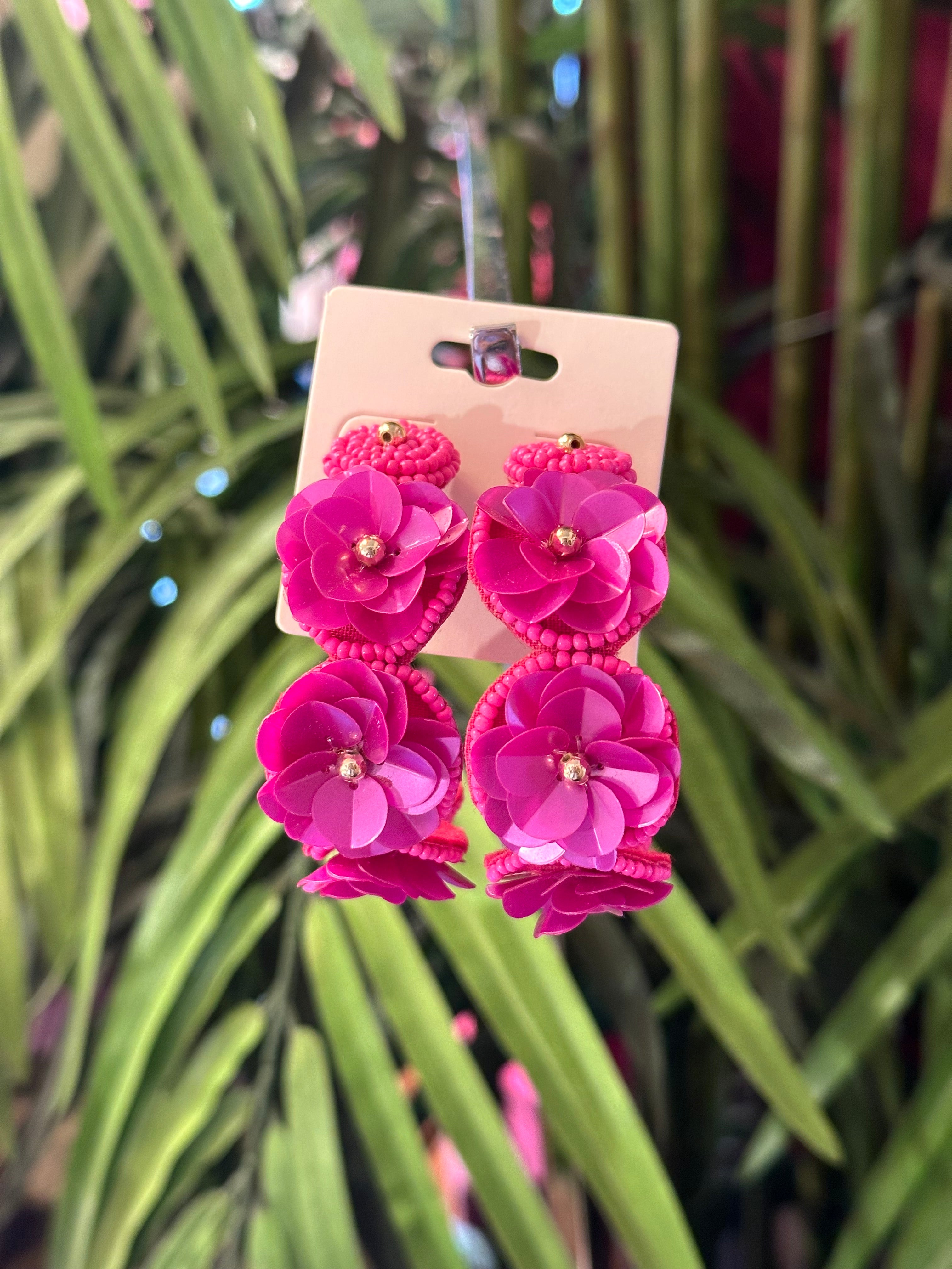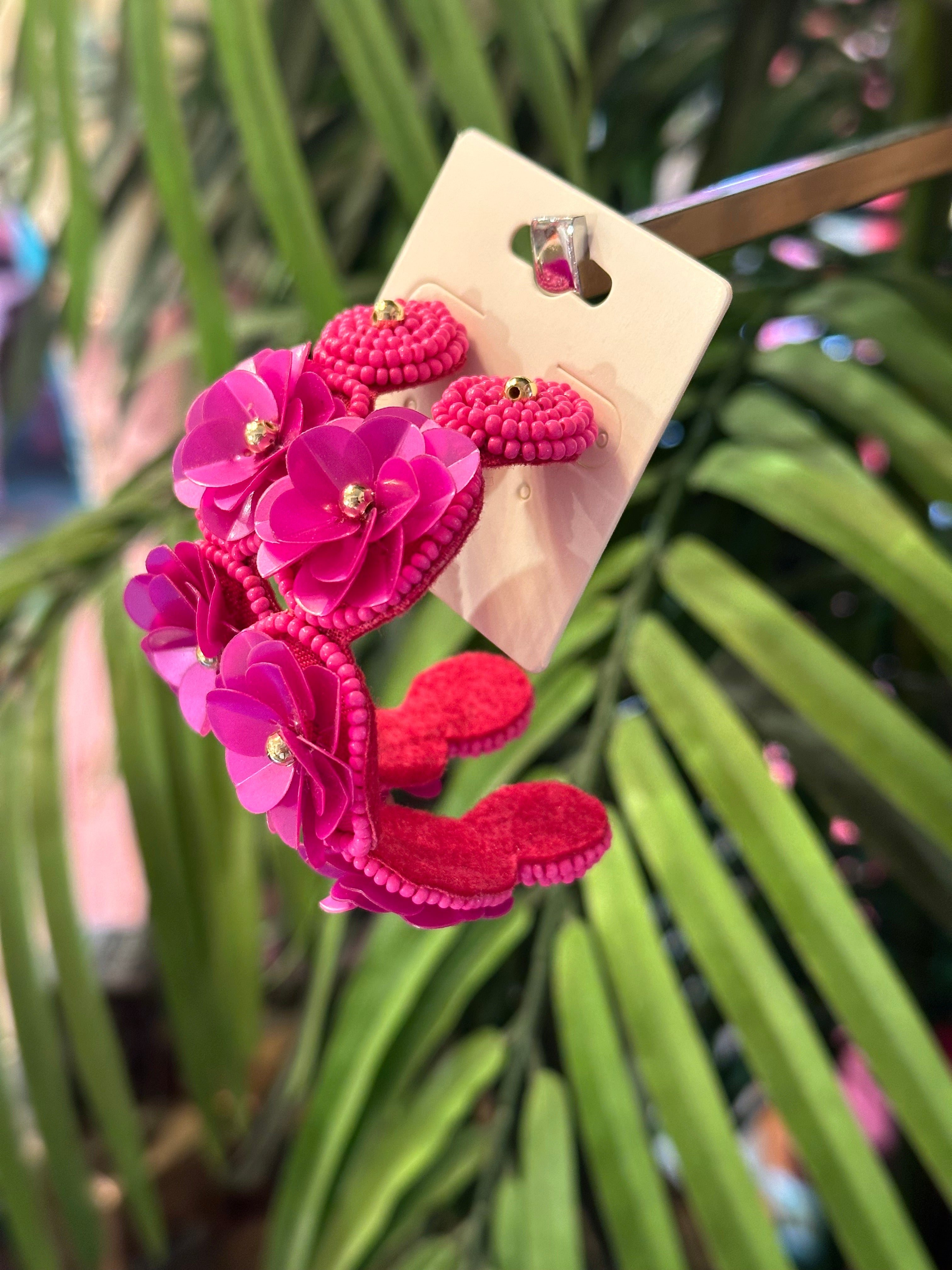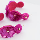 These delicate flower hoop earrings offer a beautiful balance of elegance and playfulness. Adorned with five individual flowers arranged in a row, they create a continuous, flowing hoop shape that gracefully frames your face. The vibrant fuchsia color adds a bold pop to any look, making these earrings the perfect statement piece for both casual days and evening outings.