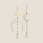 Adorn your ears in elegance with the Sandstone Astra earrings. Crafted from premium Italian neutral leather and detailed with authentic Peach Moonstone beadwork and a radiant sun pendant piece, these elevated asymmetrical drop earrings are sure to make a statement with every ensemble.