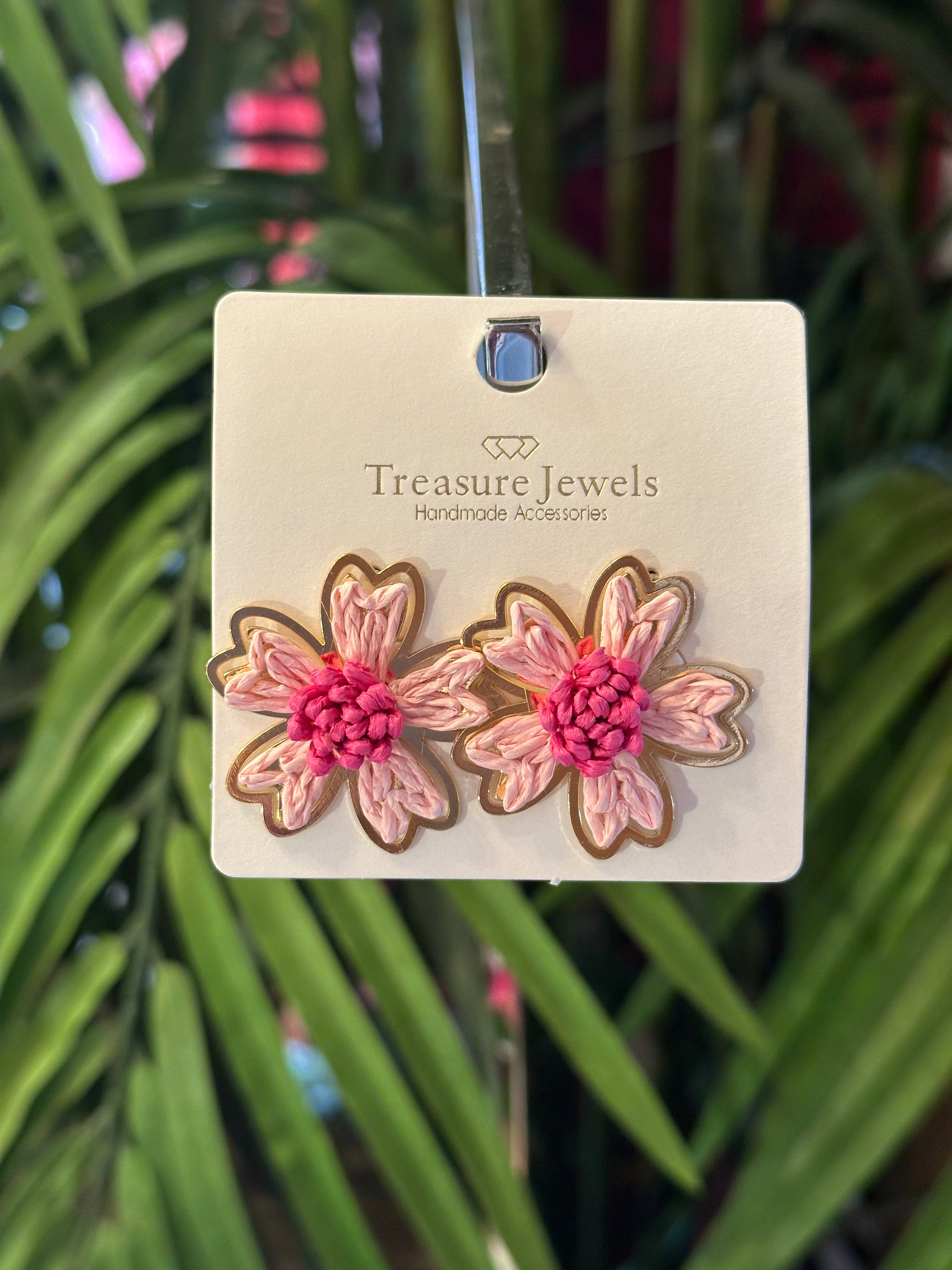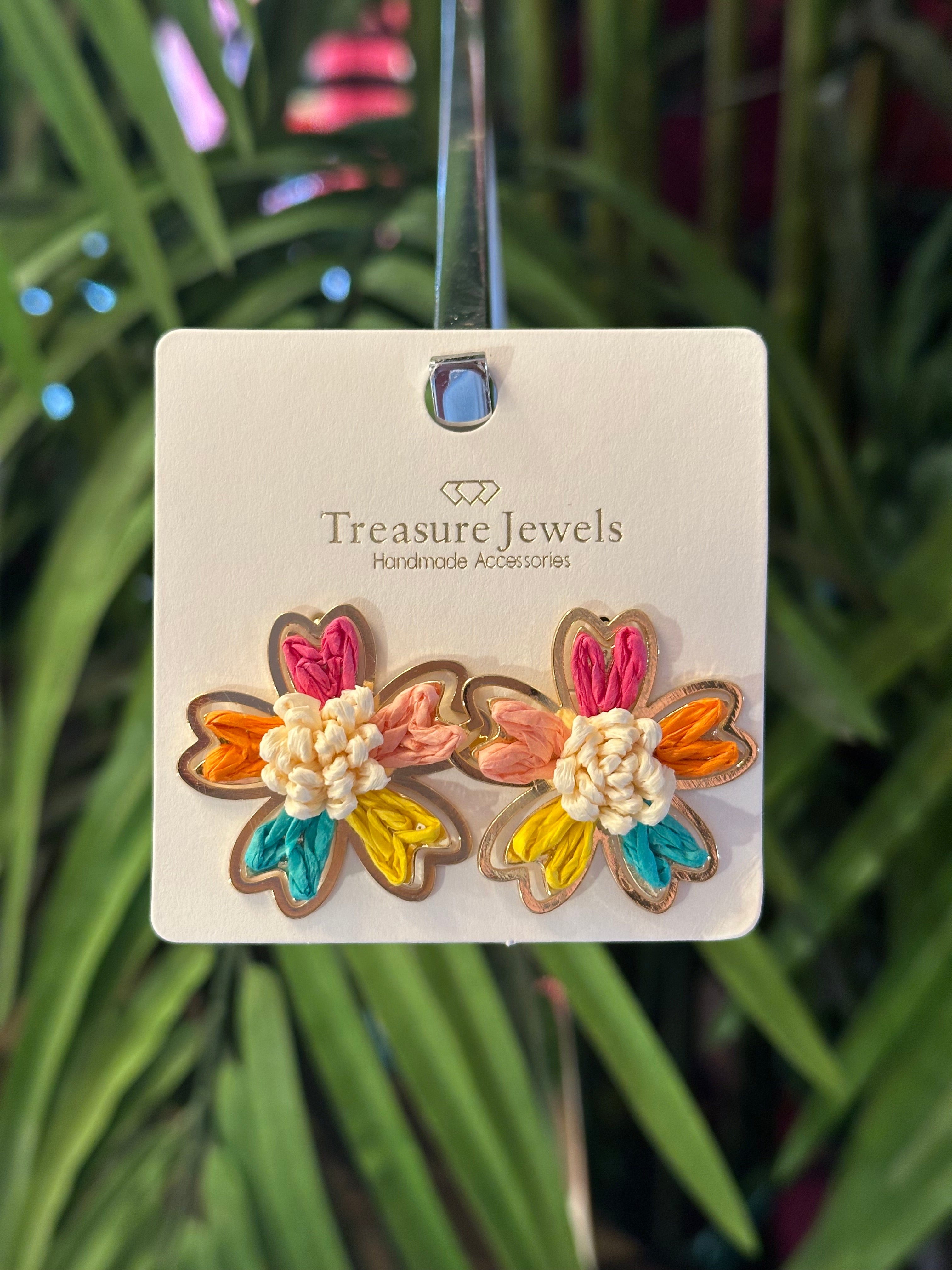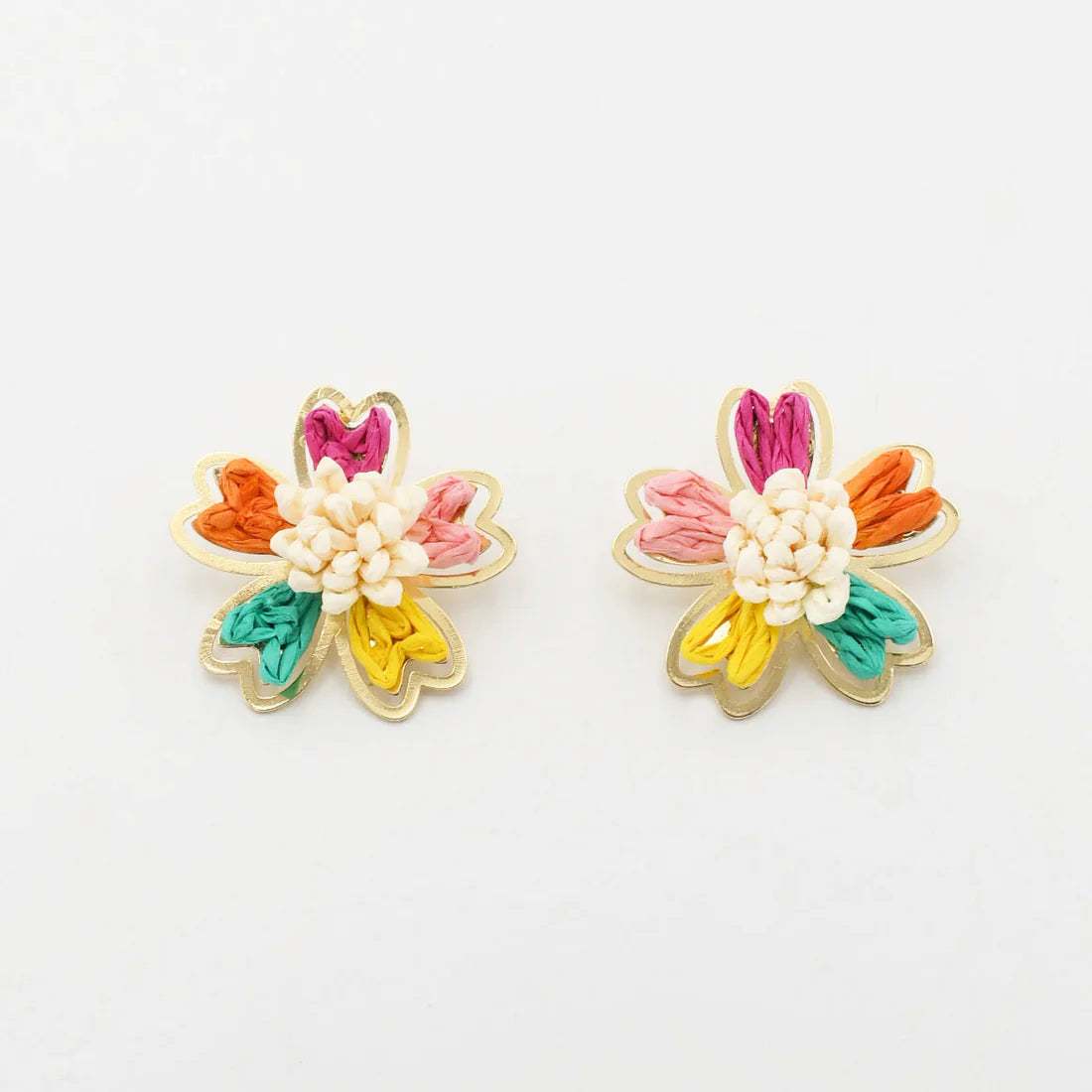 Add a pop of color and texture to your look with these charming stud earrings. Made from delicate raffia, each piece brings a burst of energy to your style. Choose from two playful color options: the multicolor version, where each petal in hues of orange, hot pink, light pink, yellow, and turquoise radiates a joyful, tropical vibe, or the pink version, with soft light pink petals and a bold hot pink center for a sweet yet striking statement.