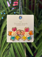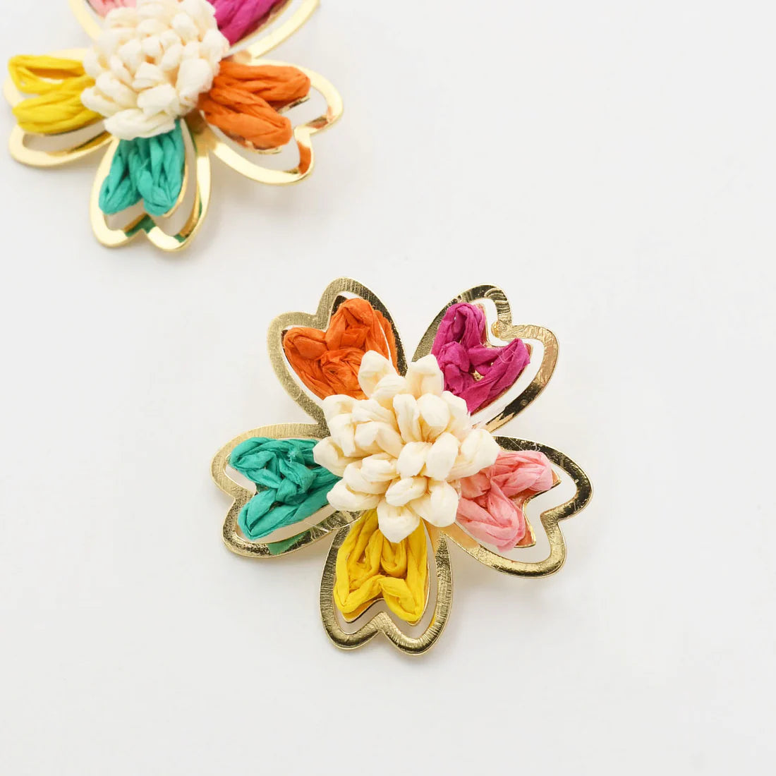 Multicolor option features five vibrant petals (orange, hot pink, light pink, yellow, turquoise) with a white center and visible metal loops behind each petal.