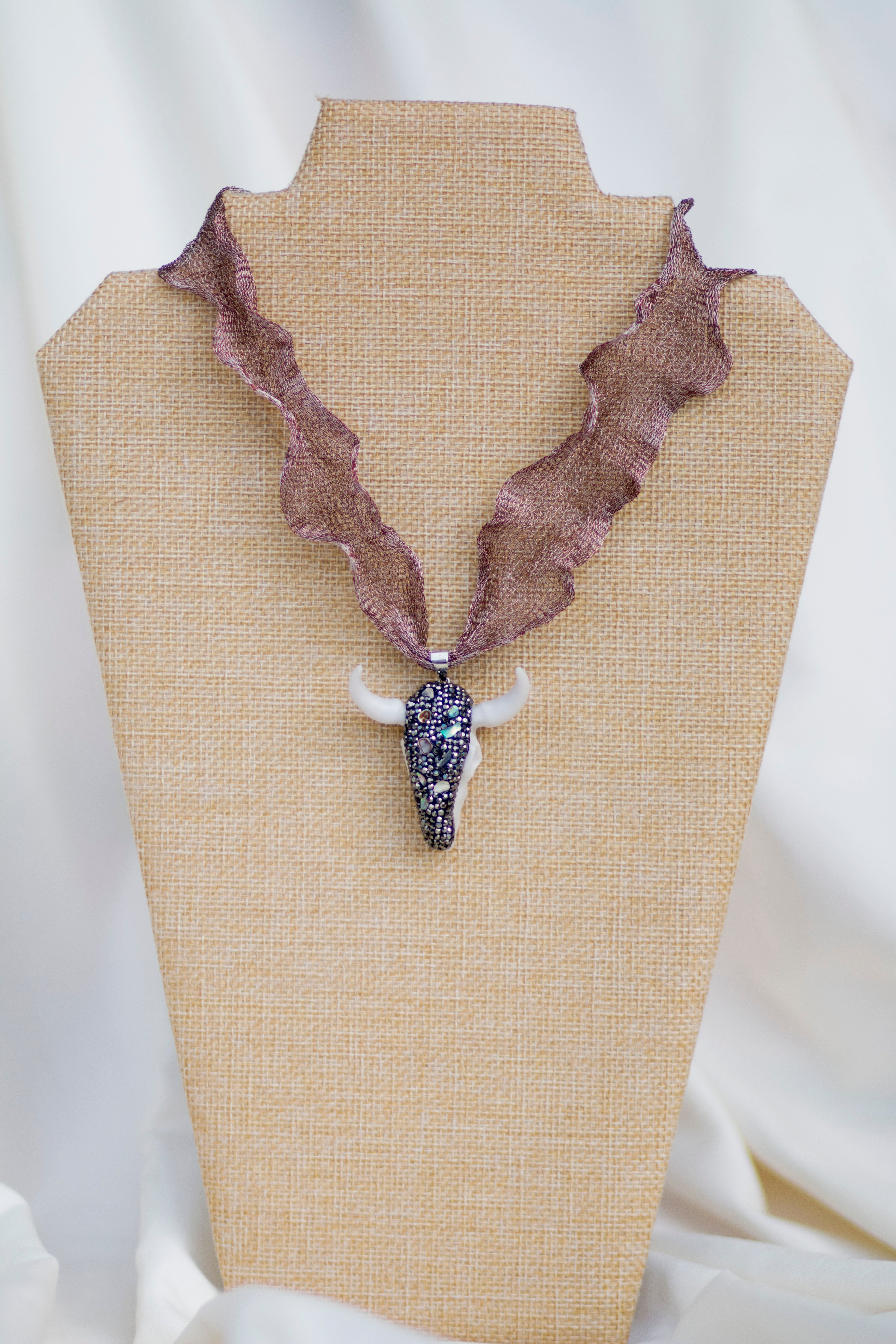 Titanium Necklace w/ Natural Stone and Shell Bejeweled Bull Pendant
