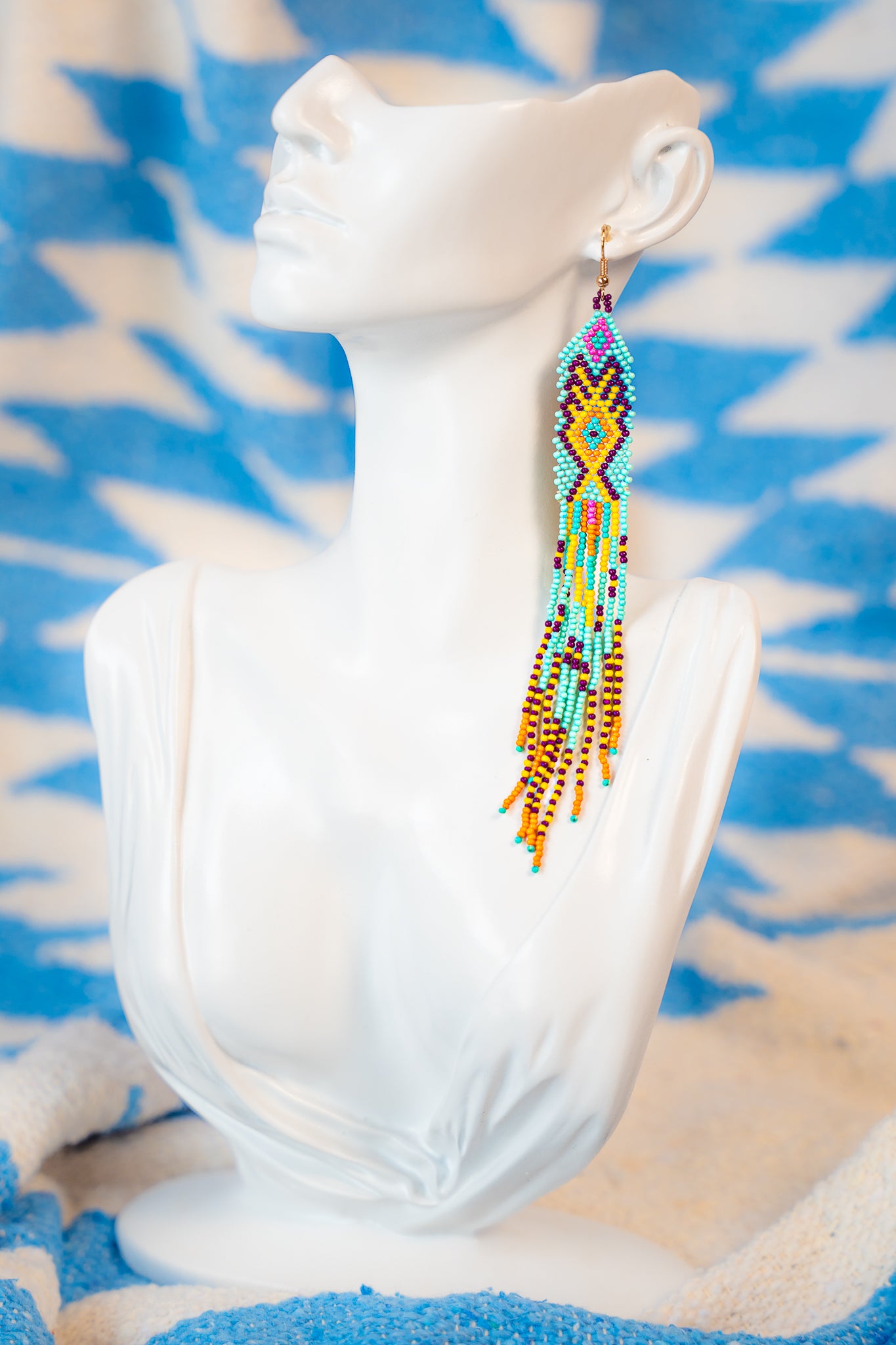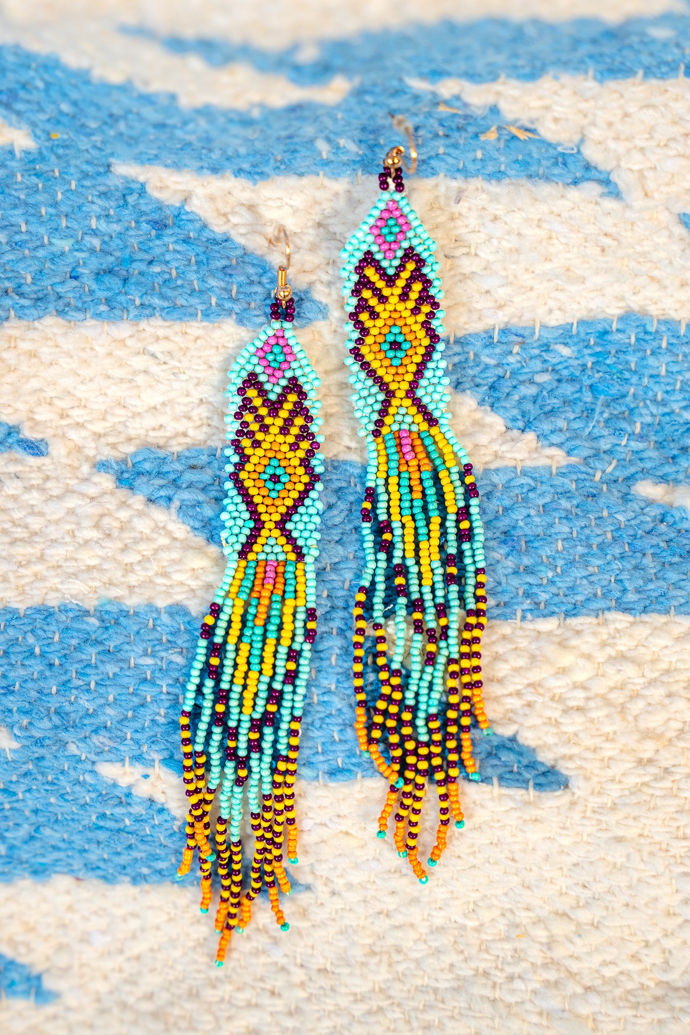 Ignite your style with these vibrant Beaded Earrings! Stunning kaleidoscope of hand-woven beads. This pair artfully blends a rich spectrum of electric blue, sunset orange, bright yellow, soft pink, and deep purple into a striking geometric pattern. Inspired by traditional tribal artistry but reimagined for the modern trendsetter, these earrings offer a bold, multi-colored statement that effortlessly transitions from festival grounds to city streets. Lightweight, energetic, and rich in texture, they are the ultimate accessory for those who refuse to blend in."