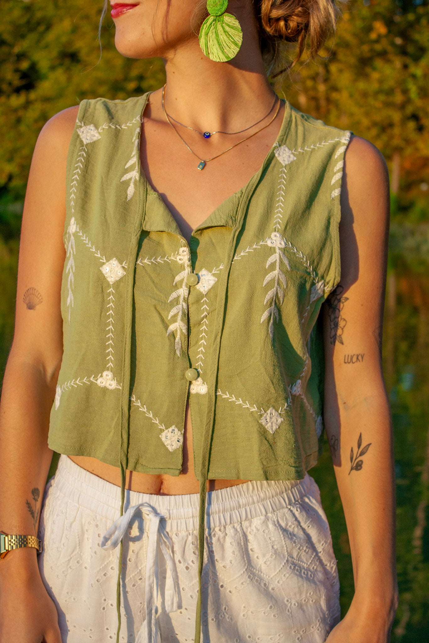 This cheerful green vest is bursting with hand-stitched Spanish flowers, making it your perfect partner...read more